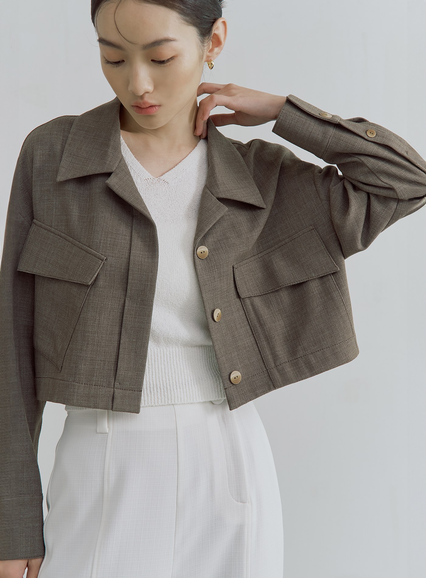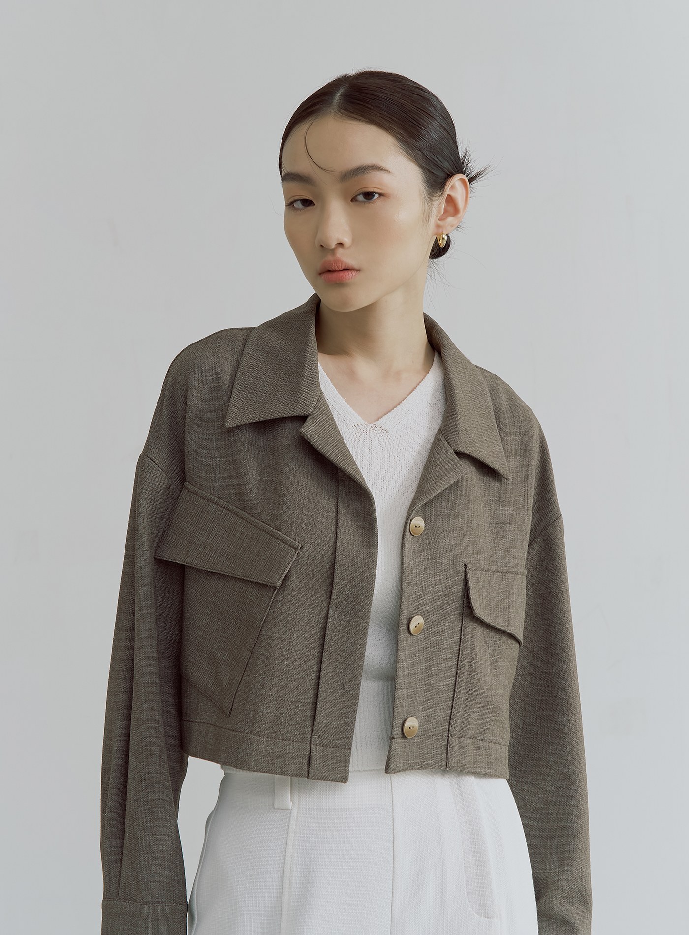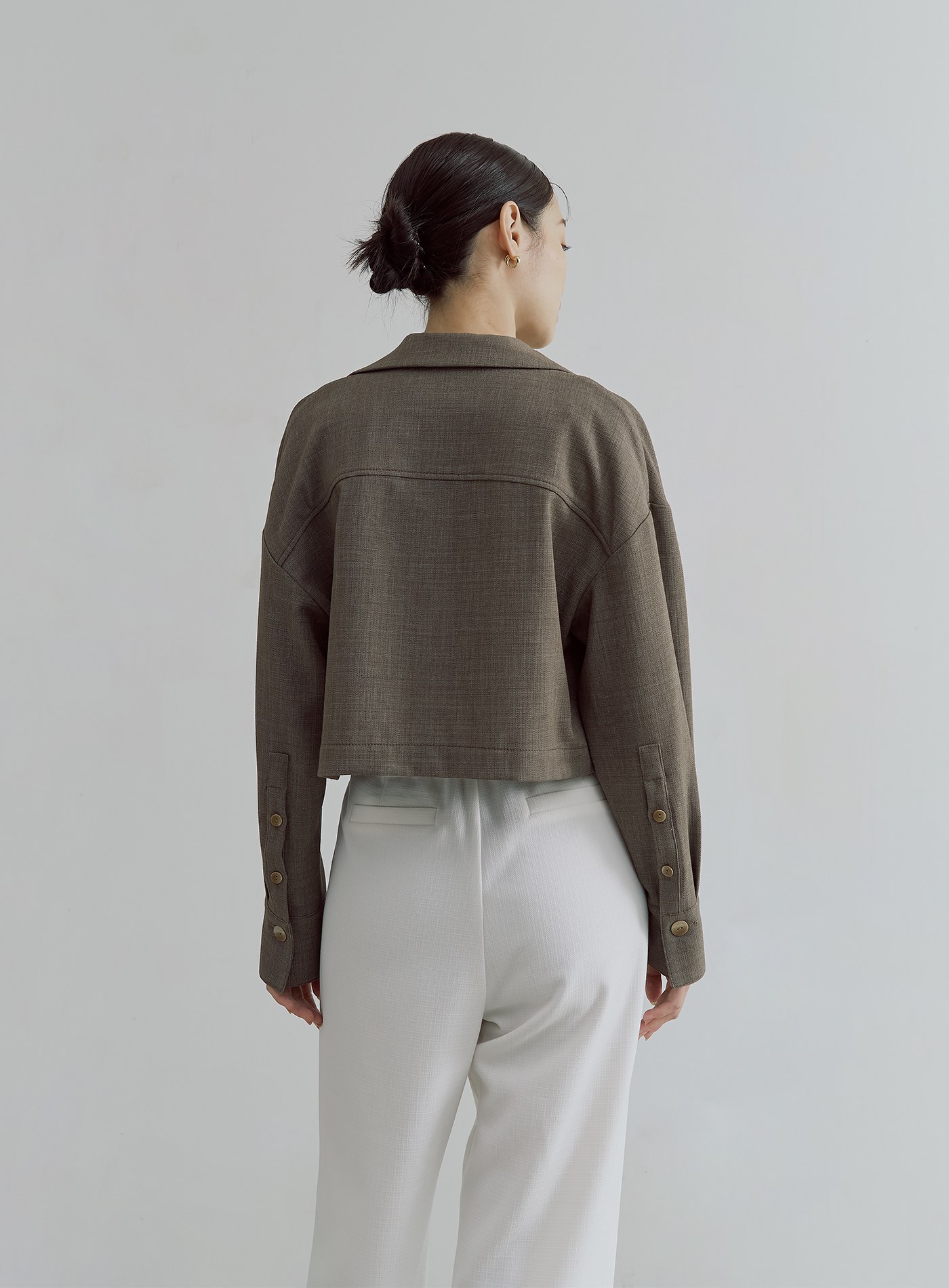 - 落肩短版剪裁,暗門襟鈕釦設計