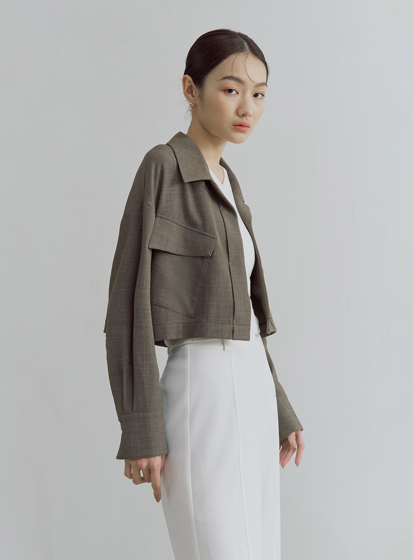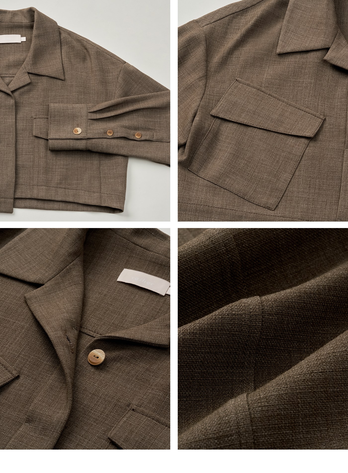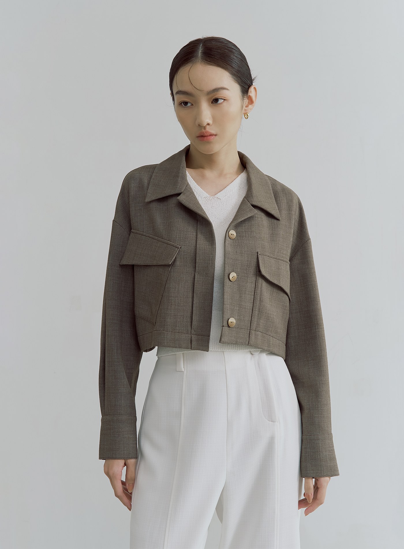 - 落肩短版剪裁,暗門襟鈕釦設計