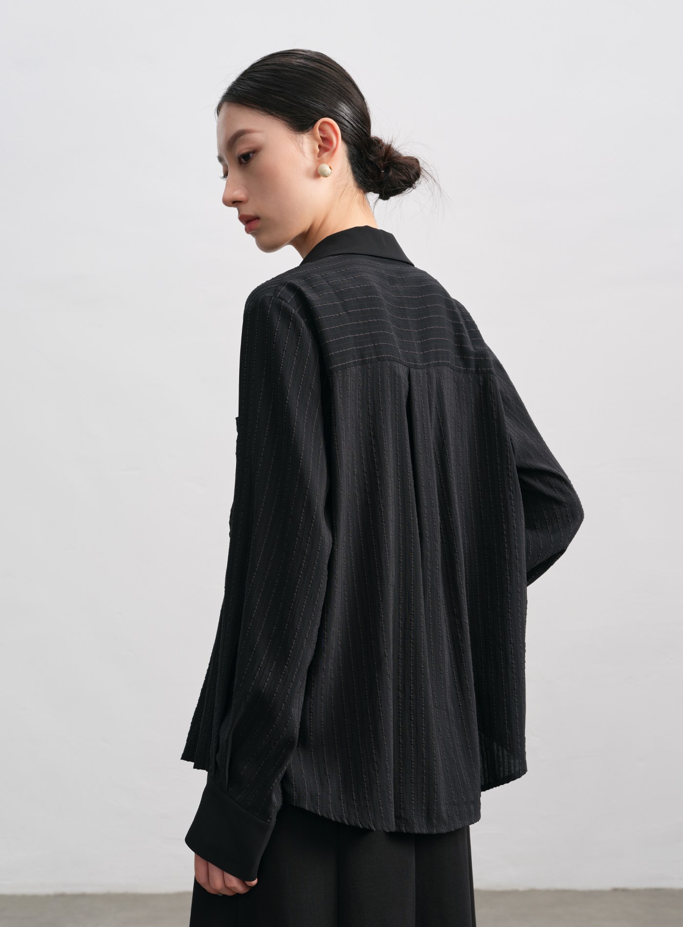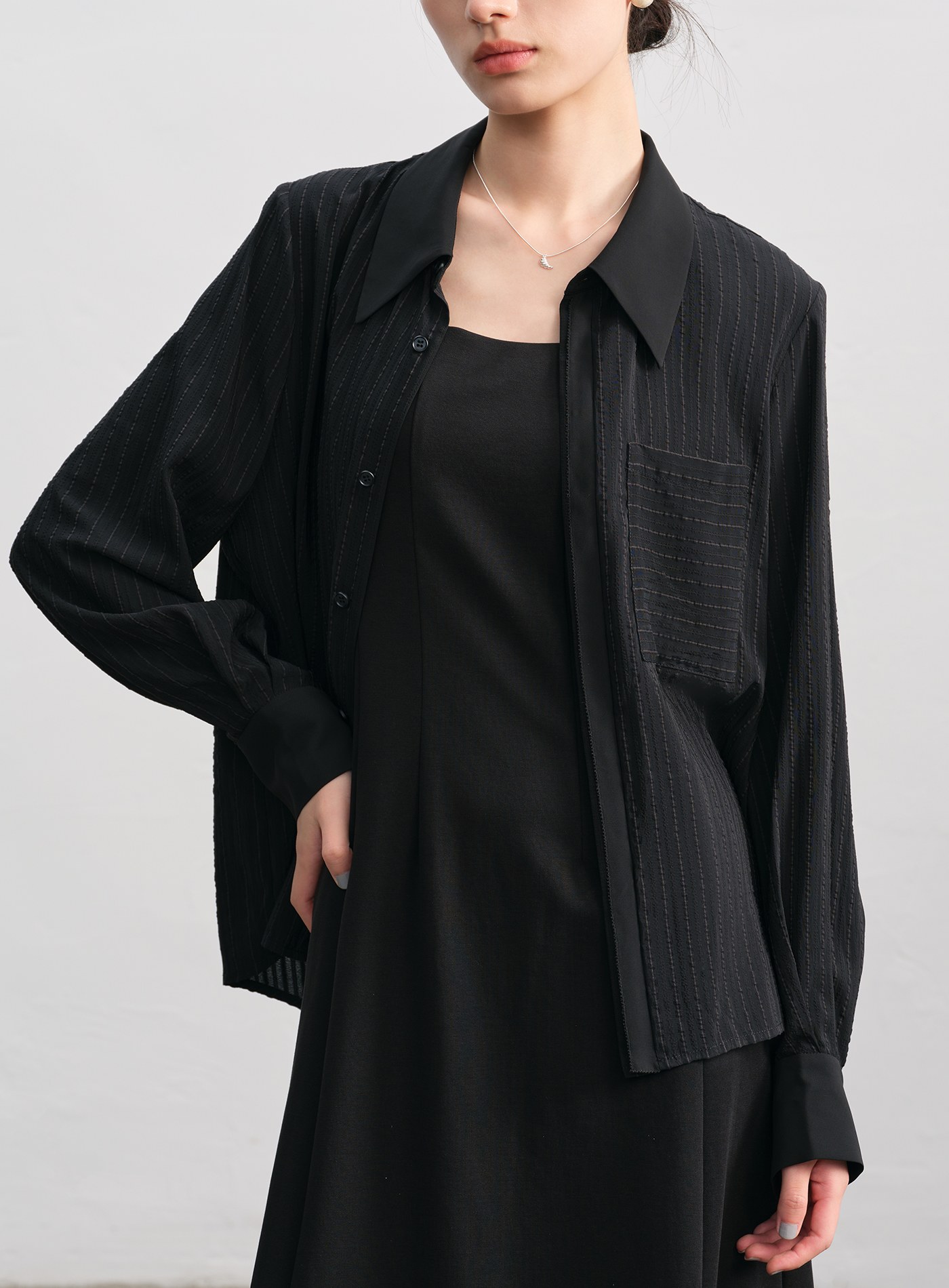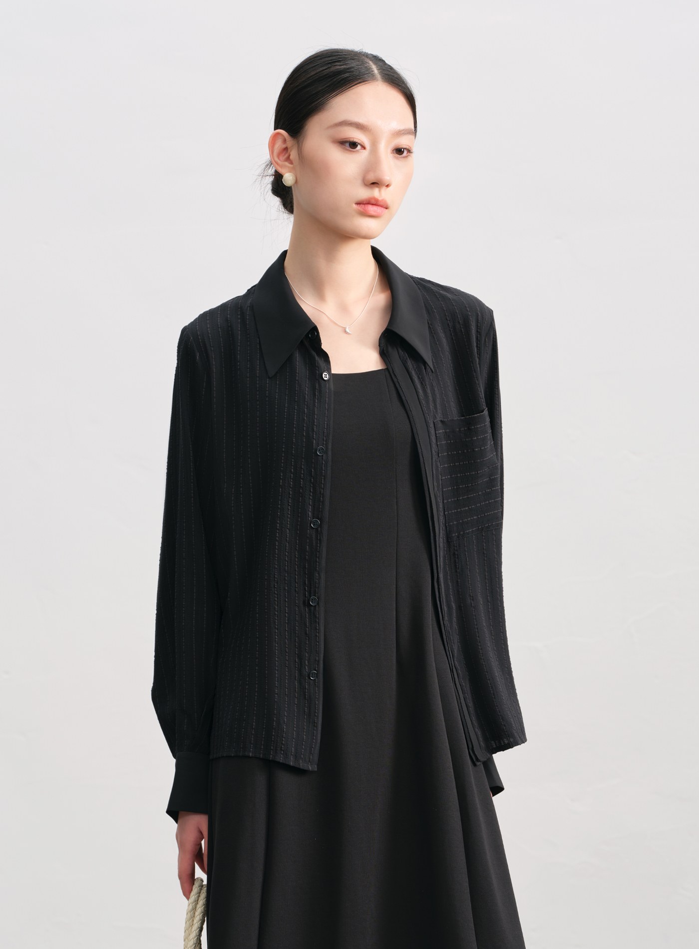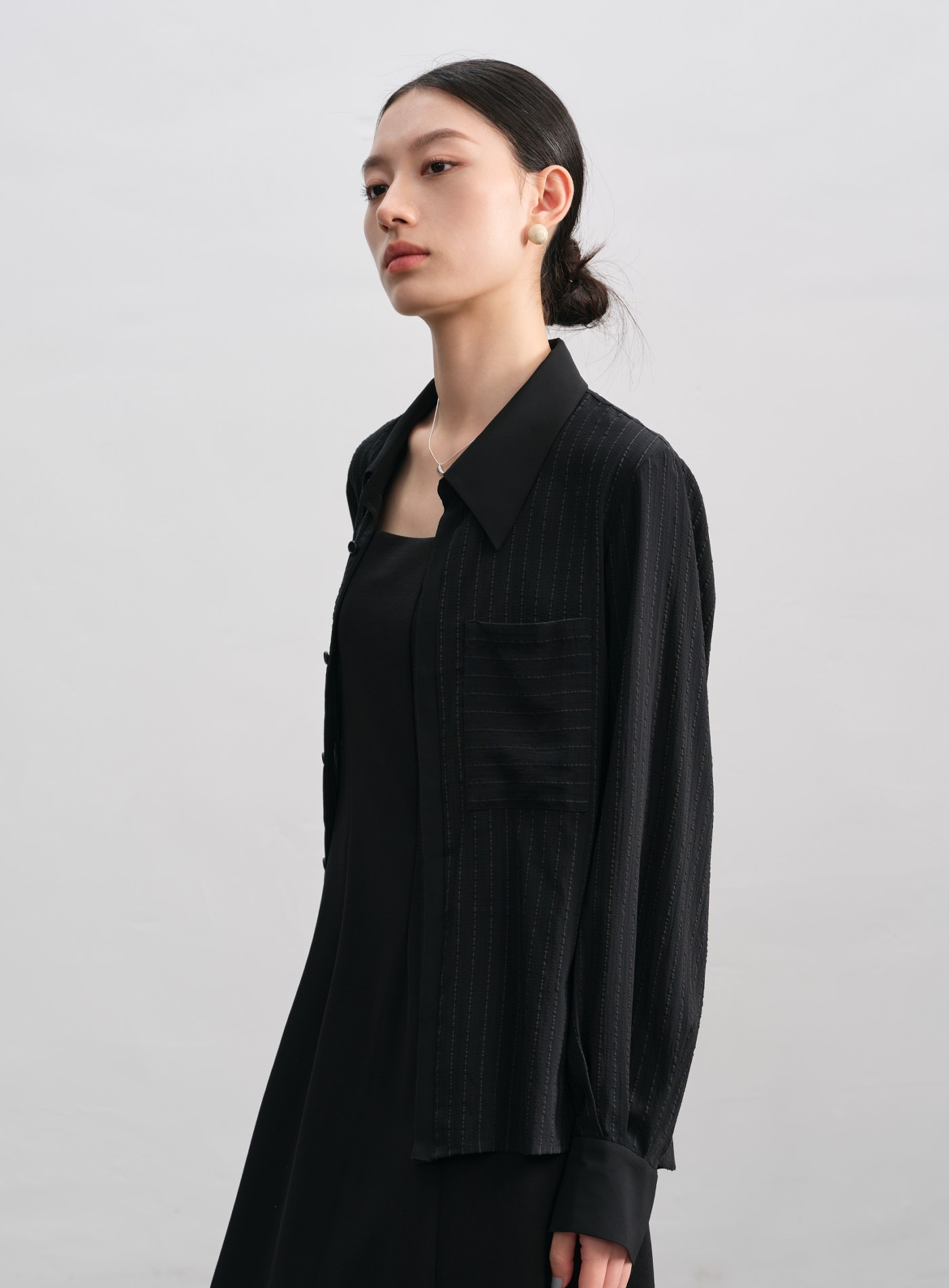 - 寬鬆剪裁,微透材質與不對稱前後下擺更顯層次。微落肩設計與門襟對絲工藝,細節中見精緻。
