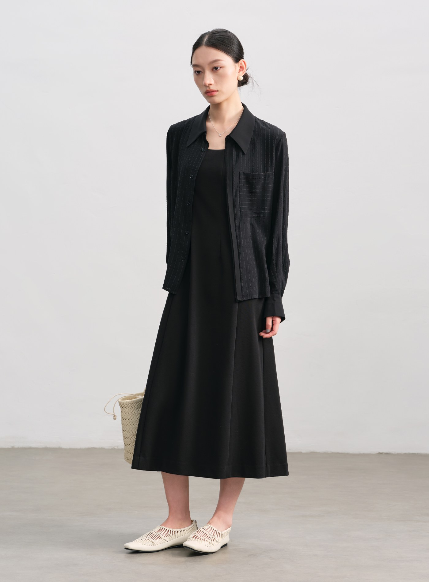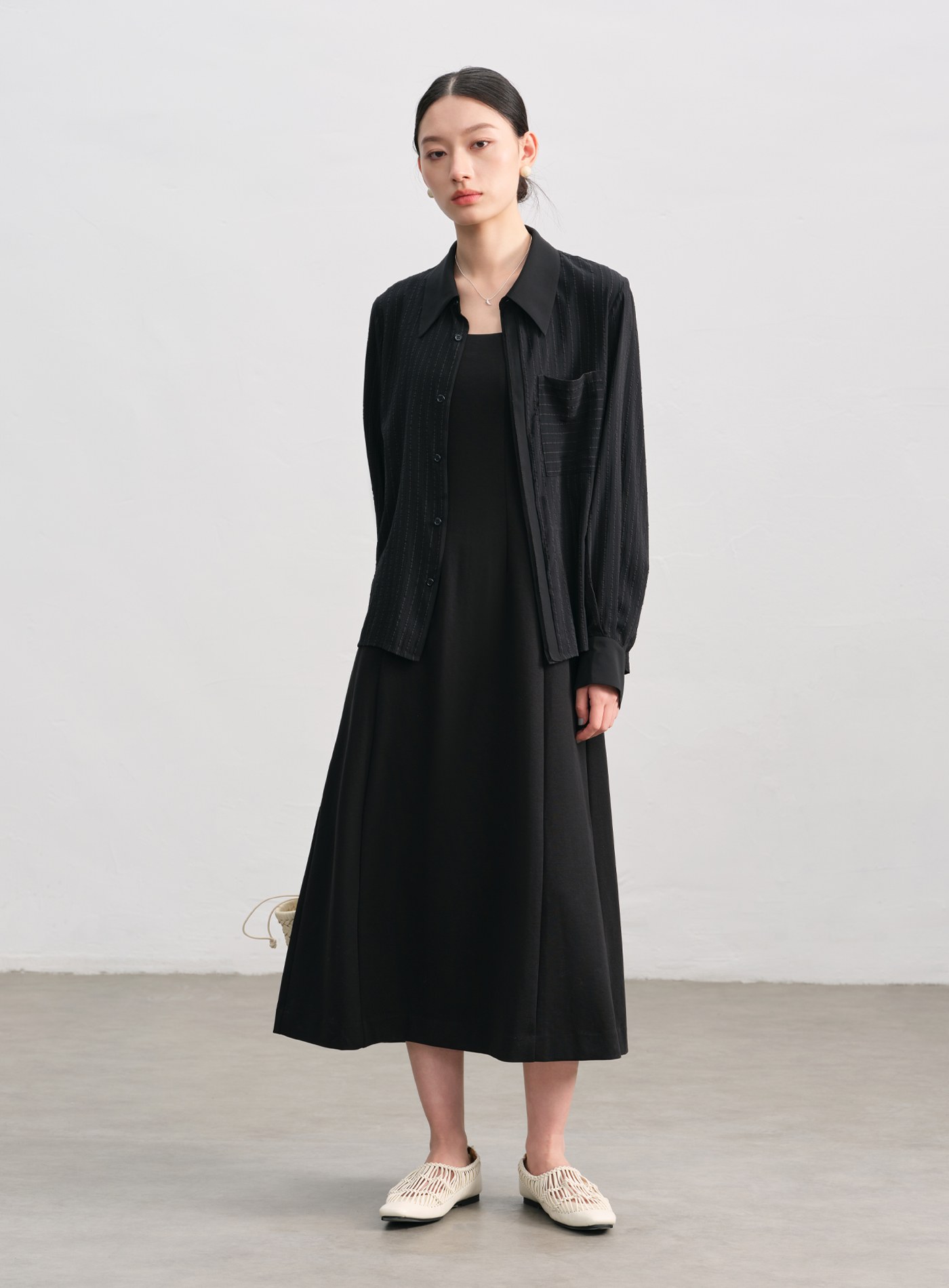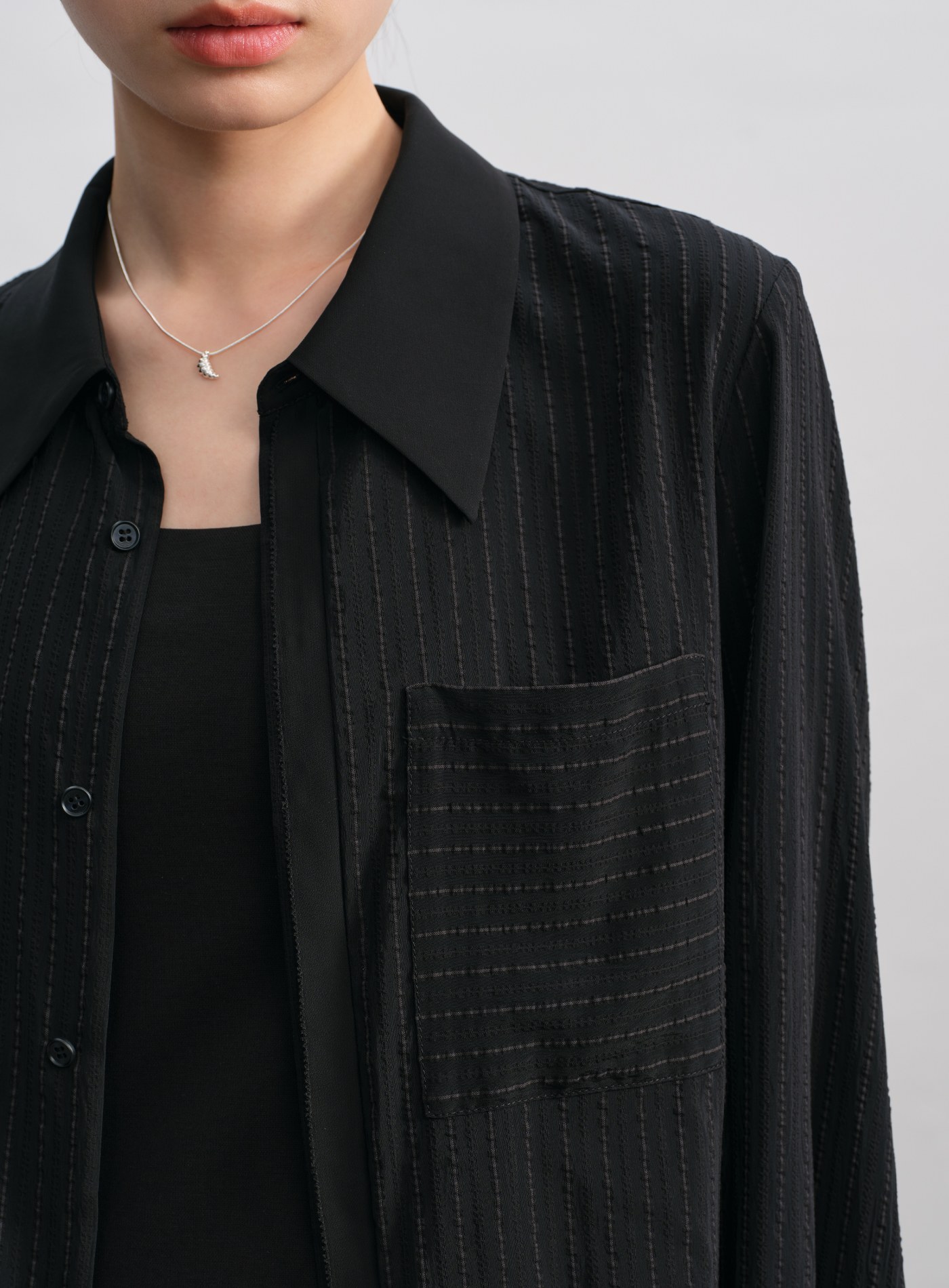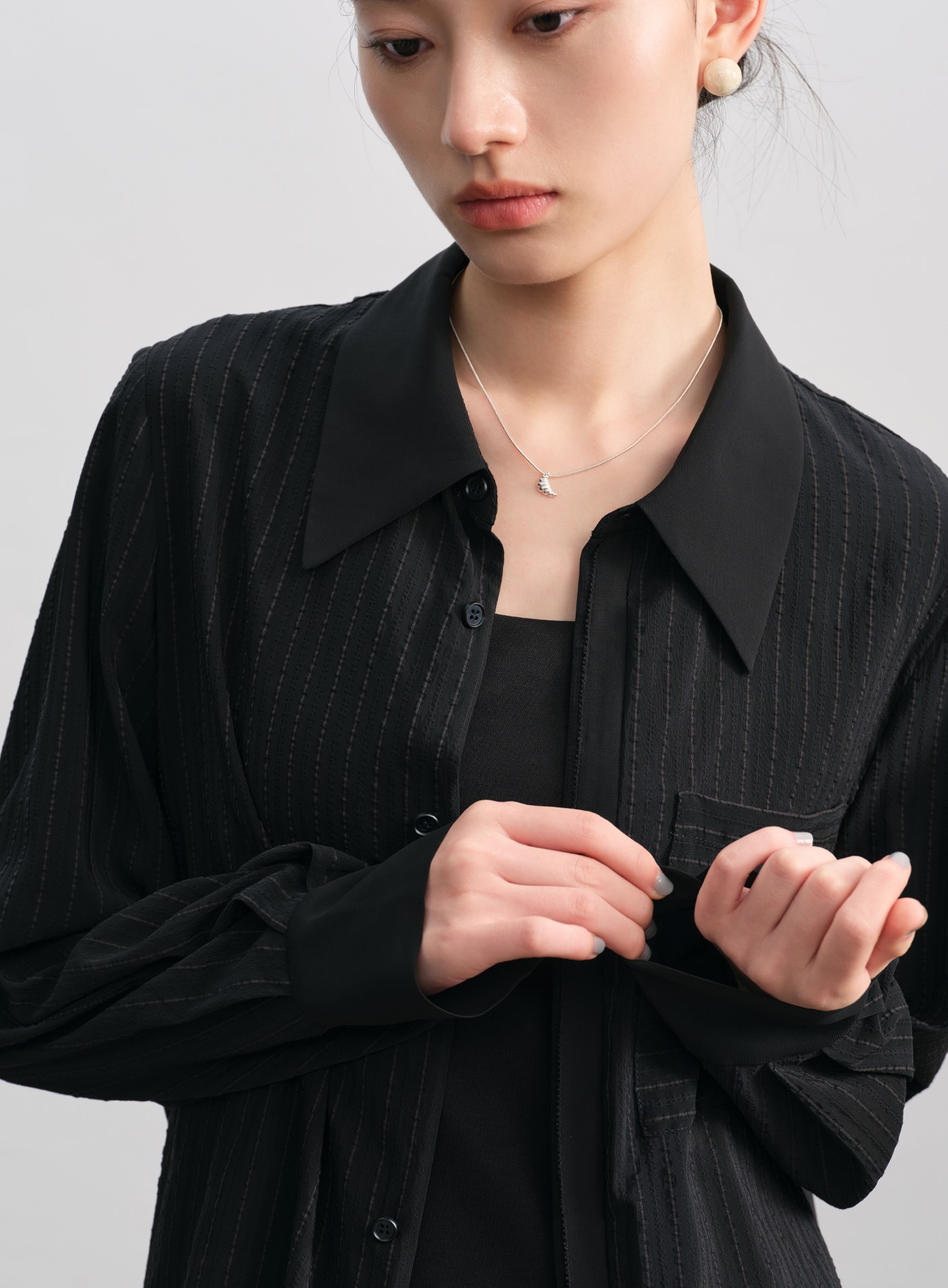 - 寬鬆剪裁,微透材質與不對稱前後下擺更顯層次。微落肩設計與門襟對絲工藝,細節中見精緻。