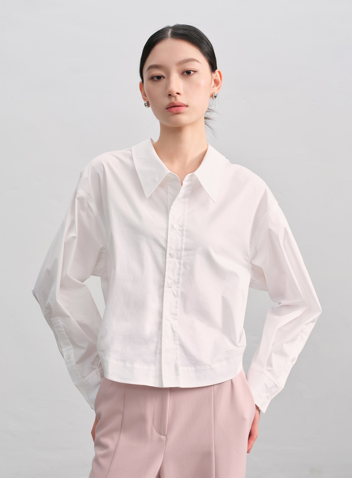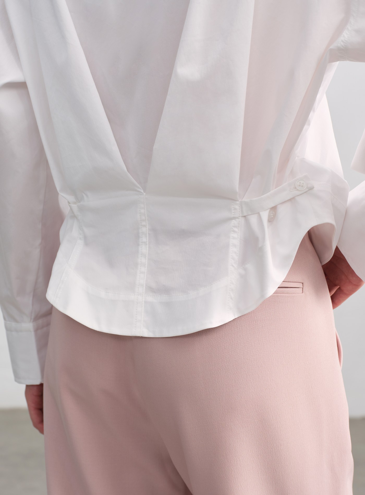 - 簡約俐落的收腰襯衫,弧形下擺前後交錯,後背皺褶帶出自然圓弧形,勾勒立體輪廓。