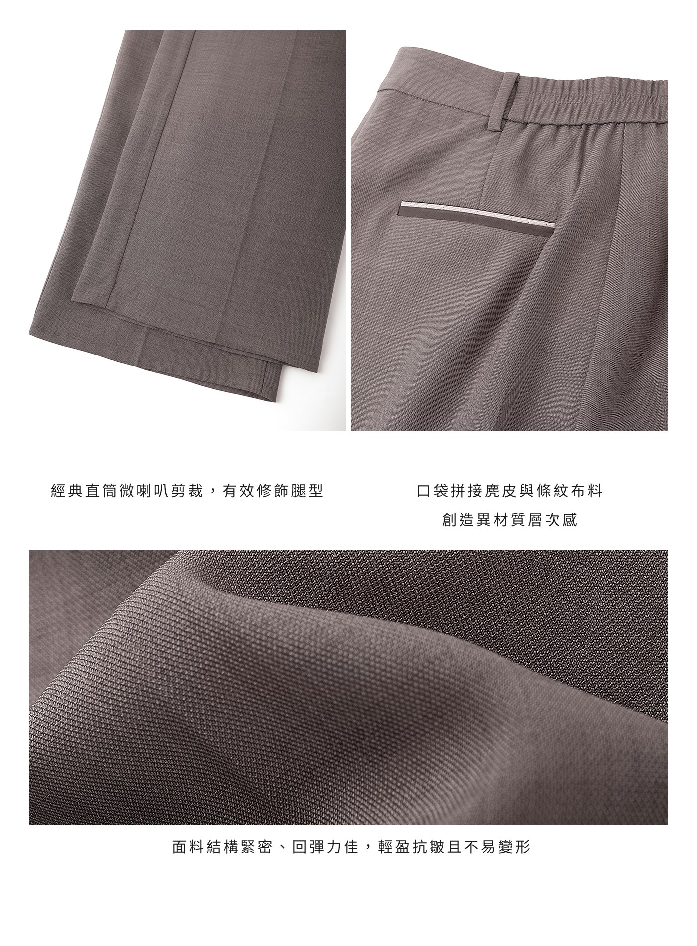 - 口袋拼接麂皮與條紋布料,異材質碰撞出優雅層次