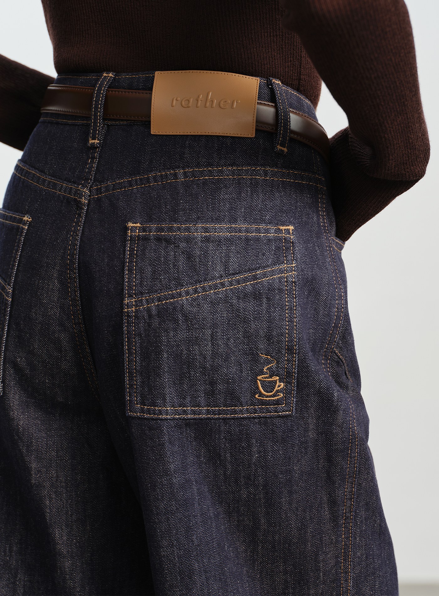 - 後貼袋特調咖啡圖案,撞色皮標與鈕釦細節