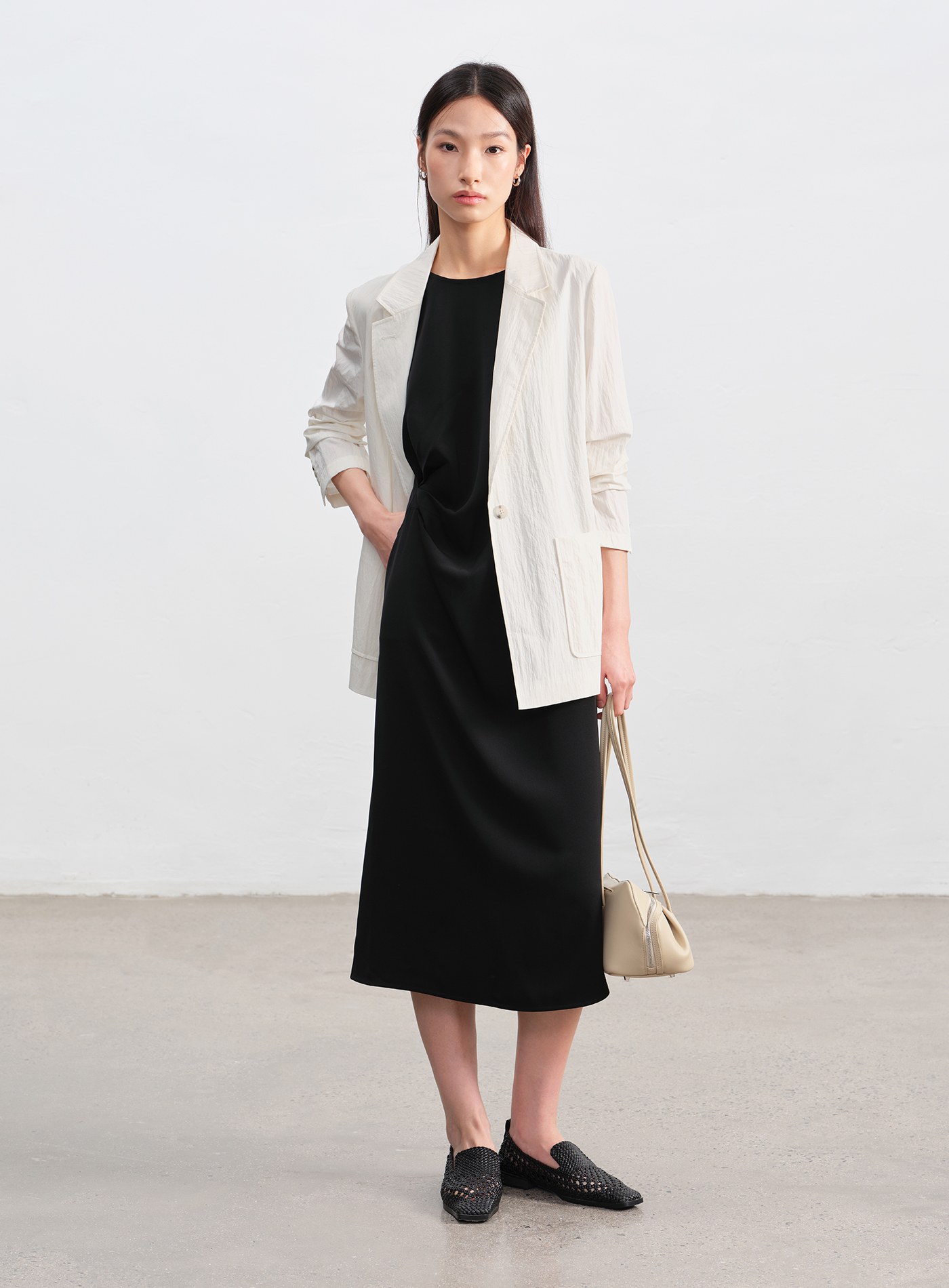 - 單邊腰部不規則壓褶,巧妙收腰修飾身形