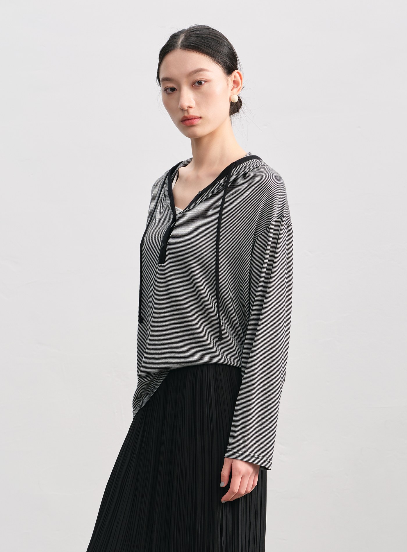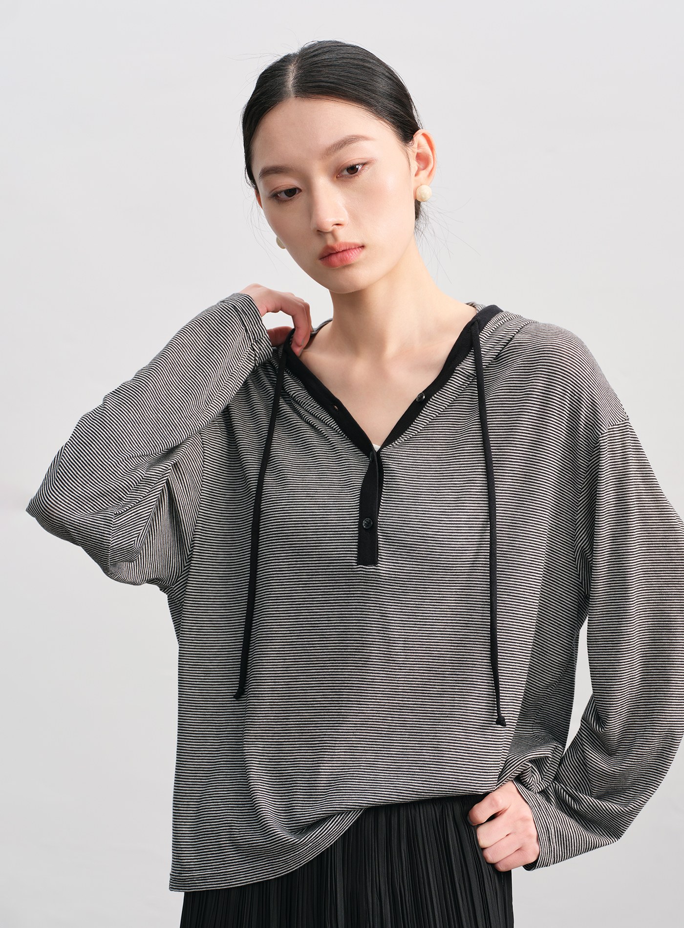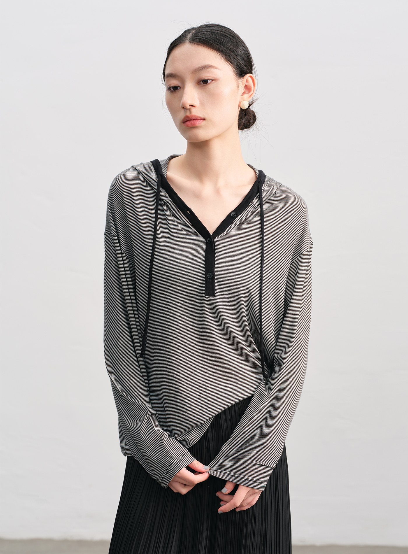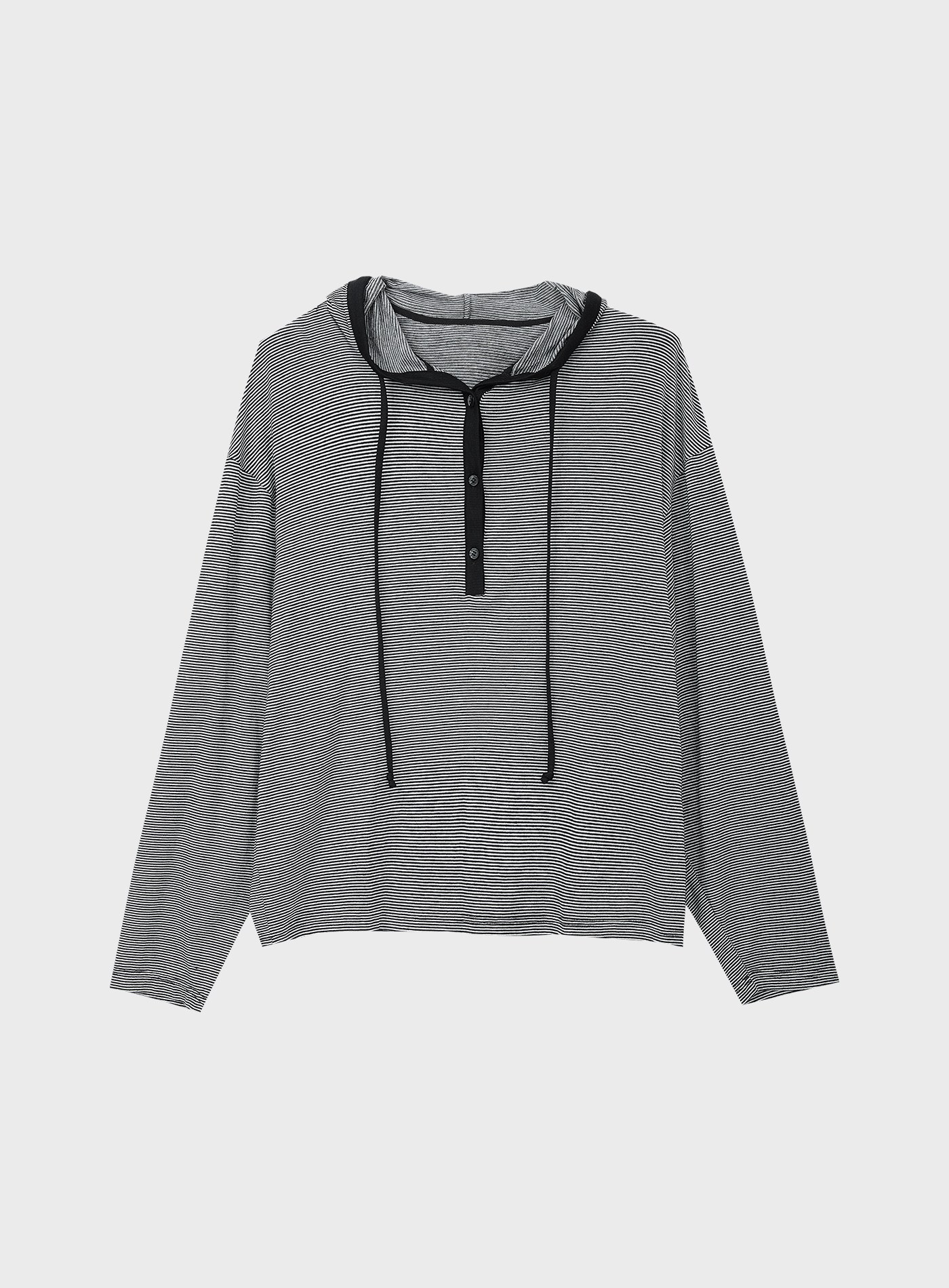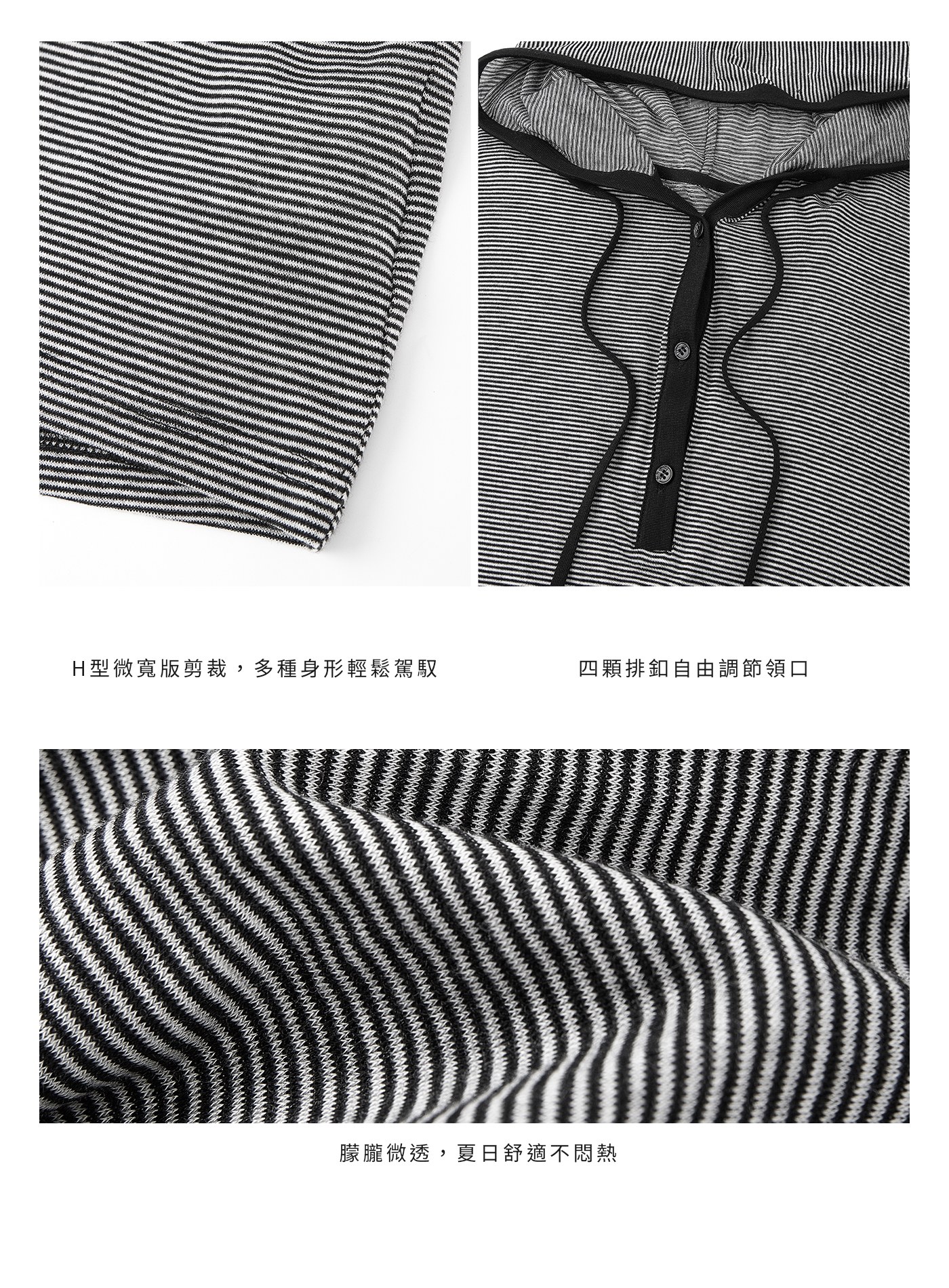 - 橫條紋設計營造法式輕盈氛圍,朦朧微透,夏日舒適不悶熱。四顆排釦自由調節領口。