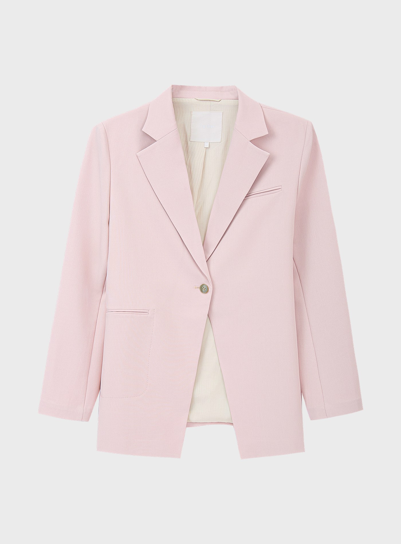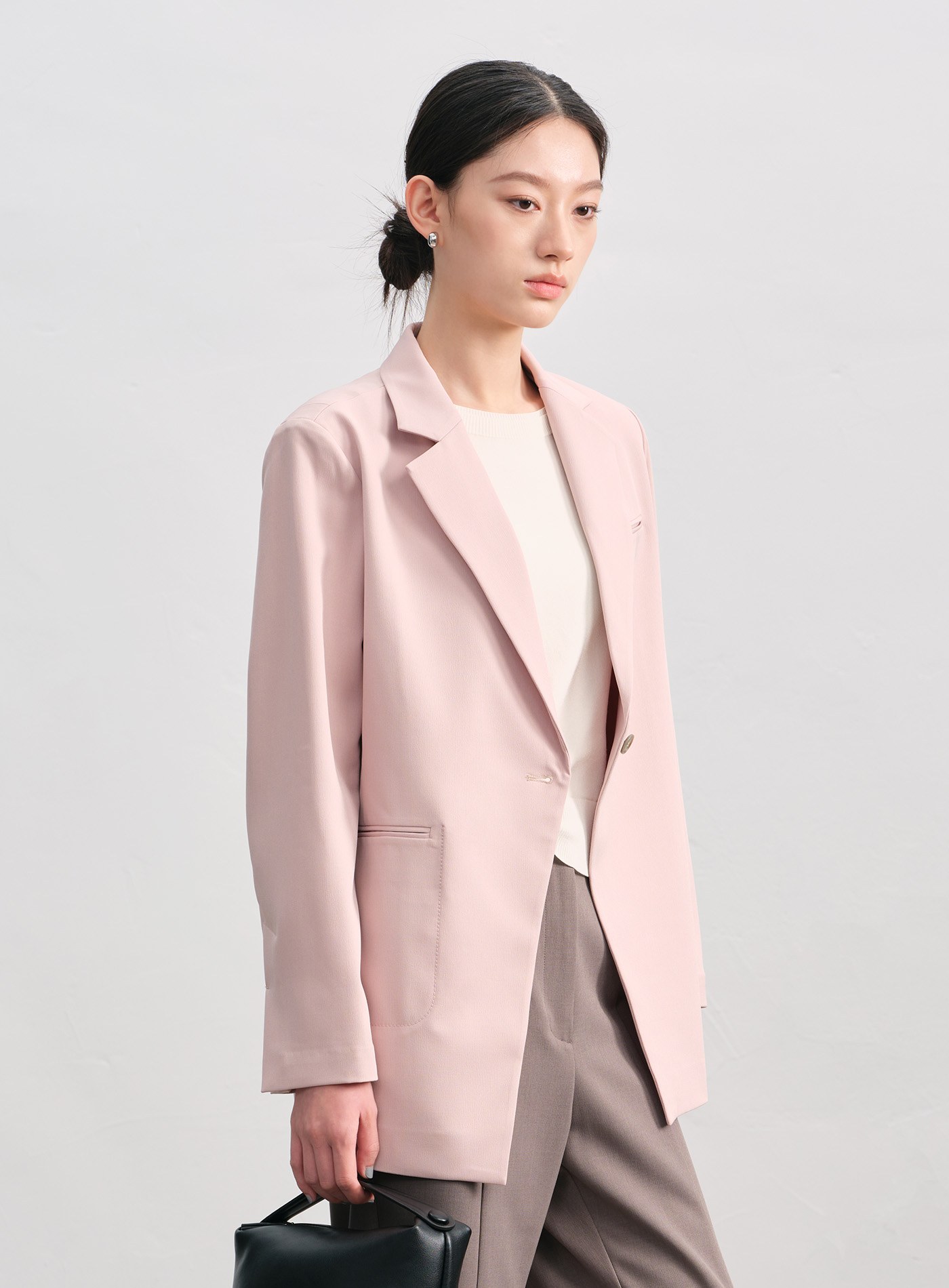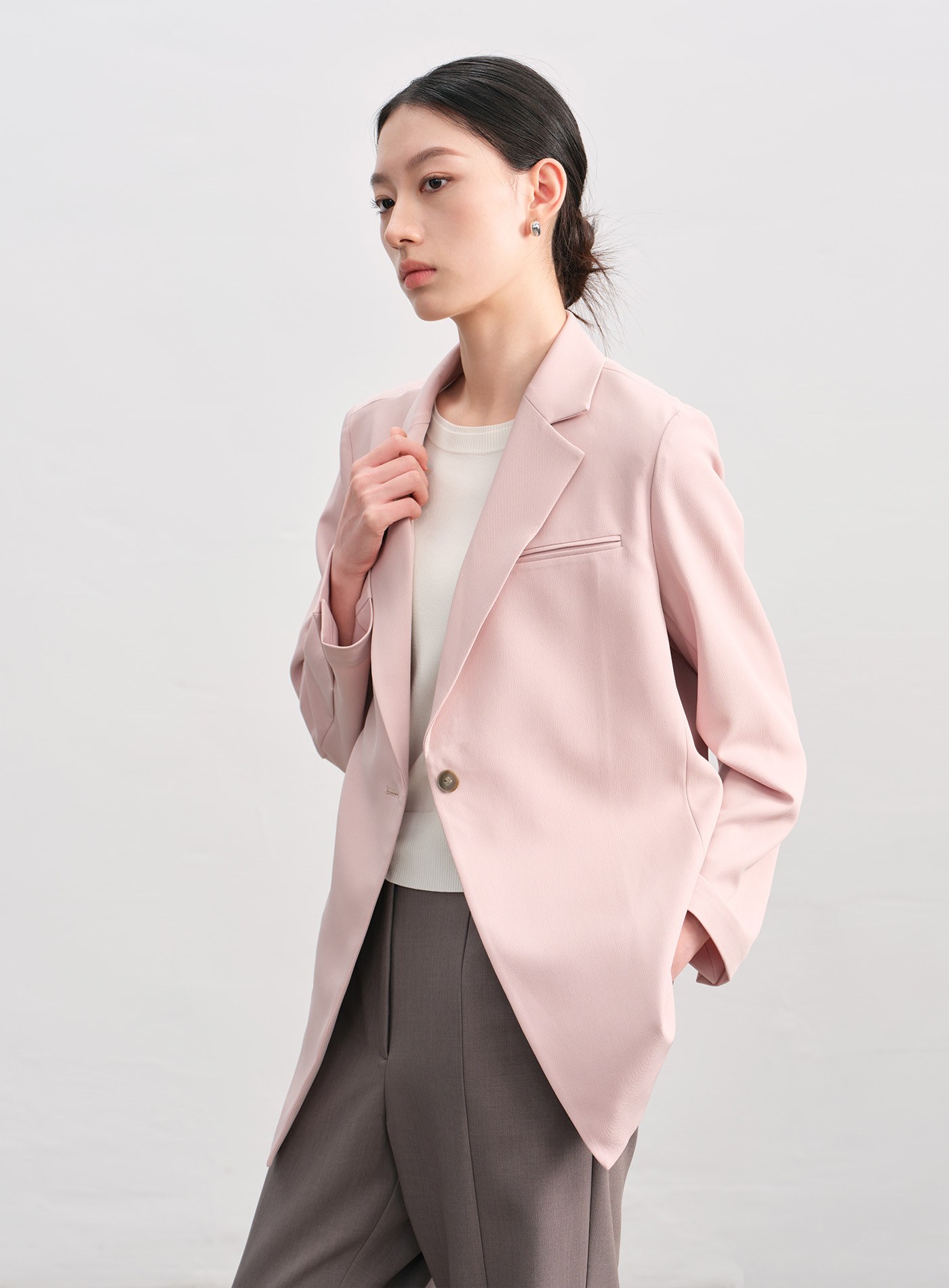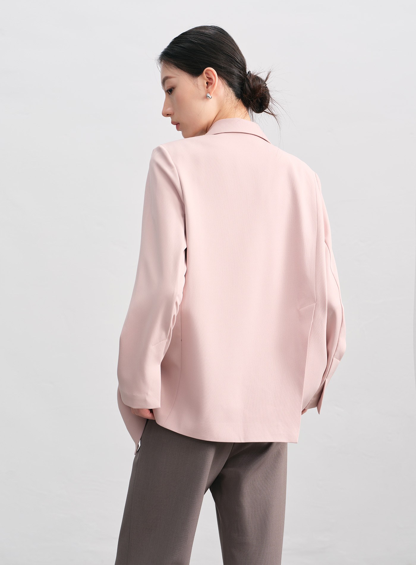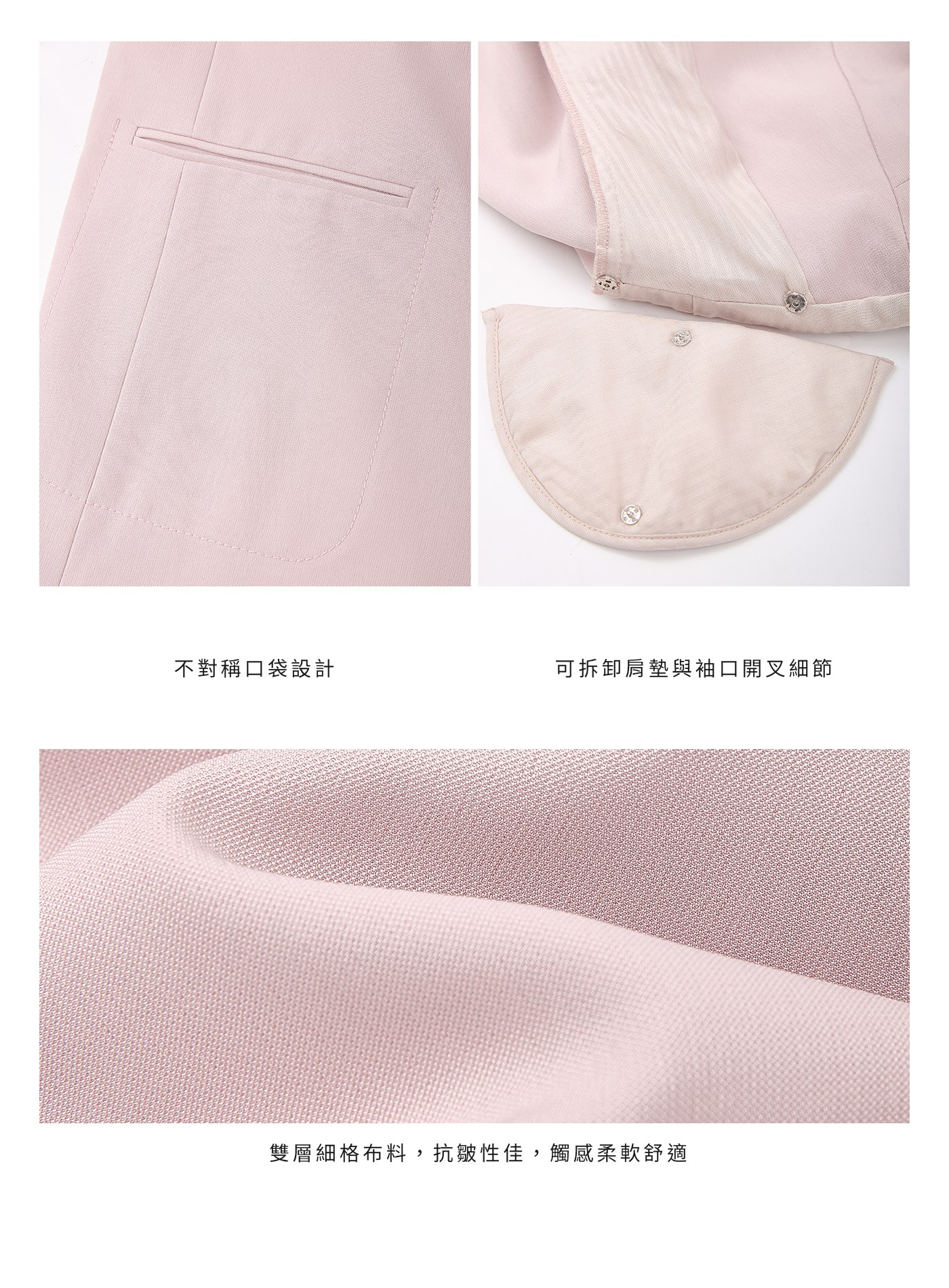- 不對稱口袋設計增添巧思,可拆卸肩墊與袖口開叉細節,實穿與造型兼具