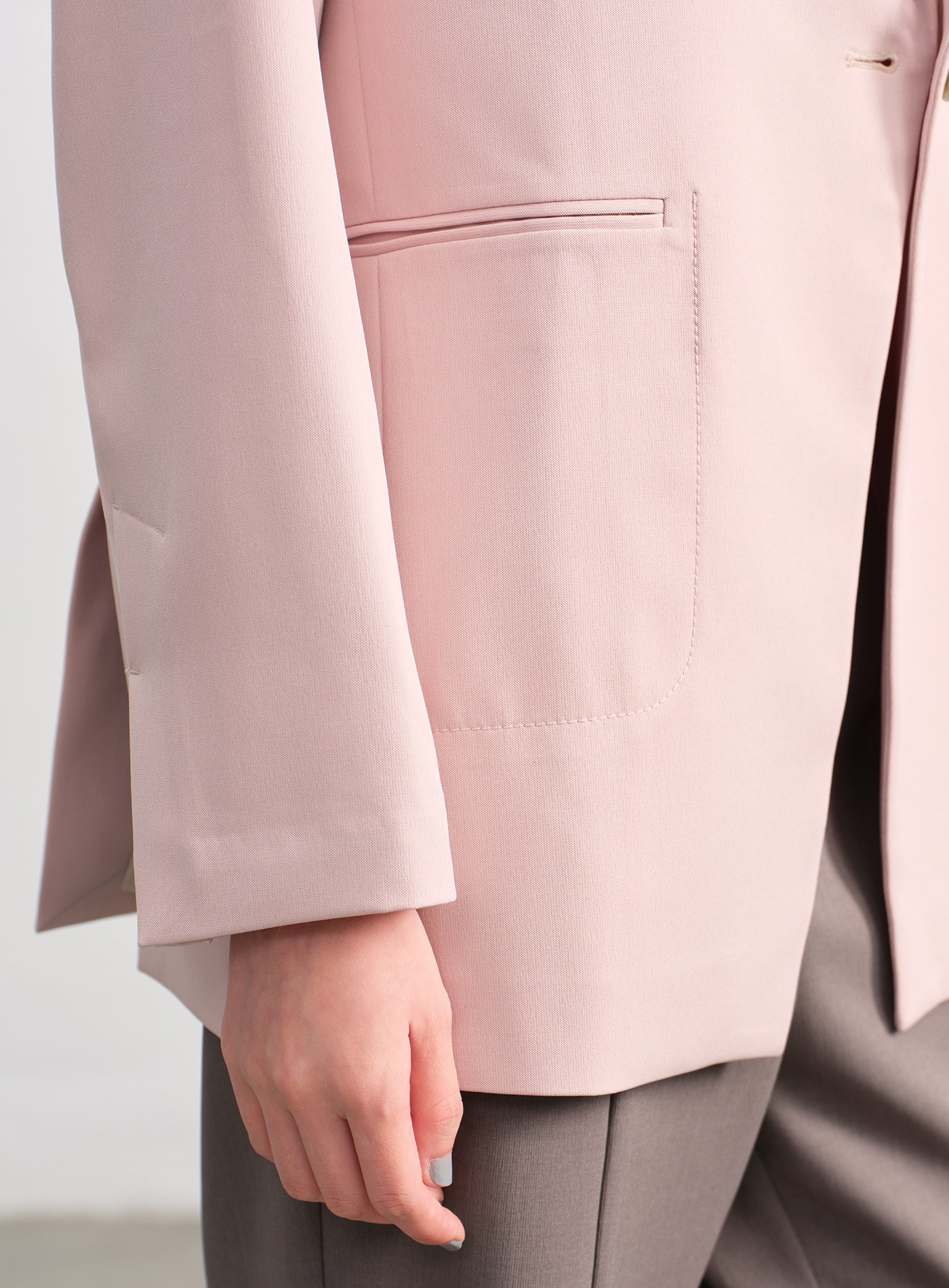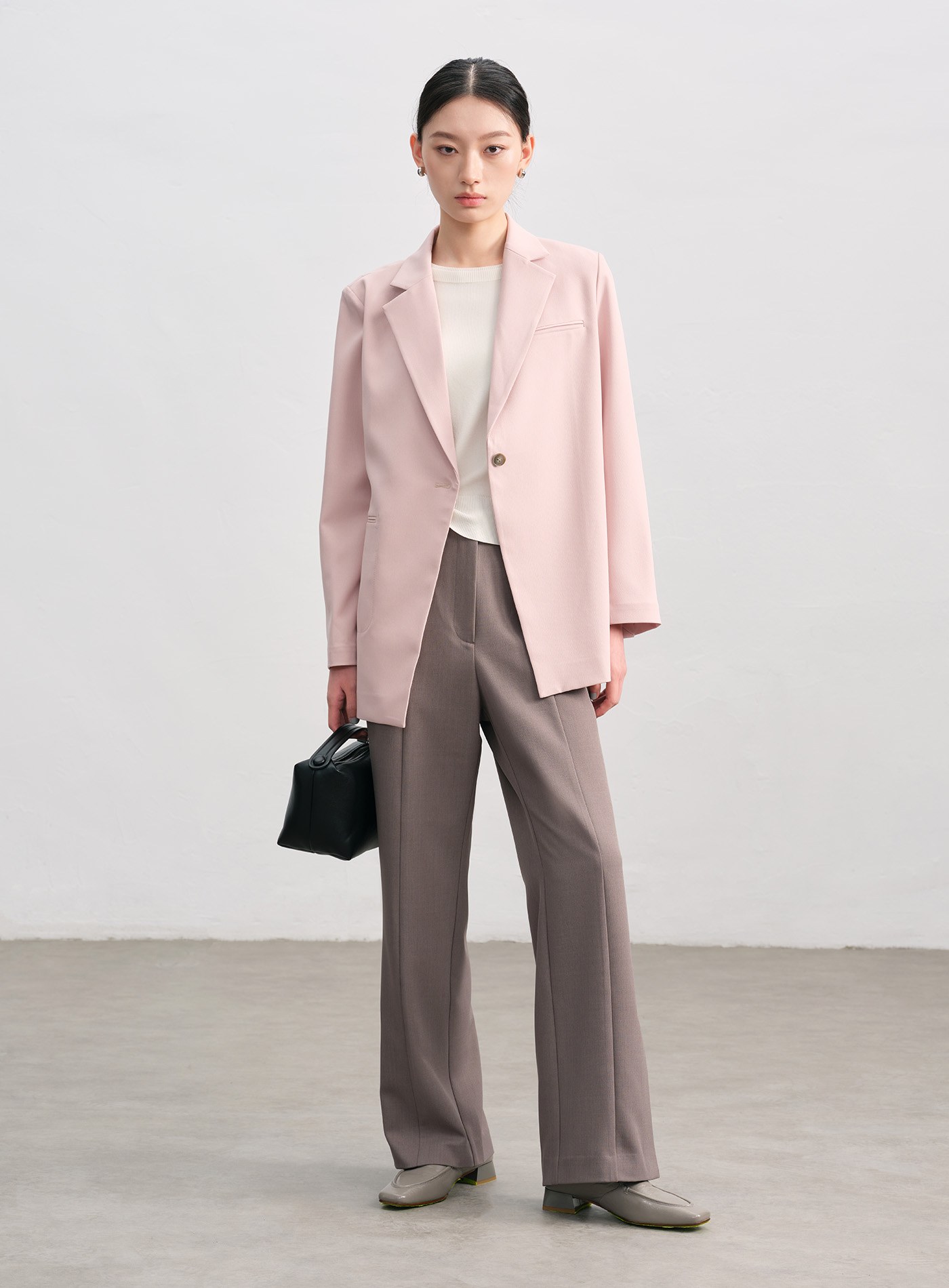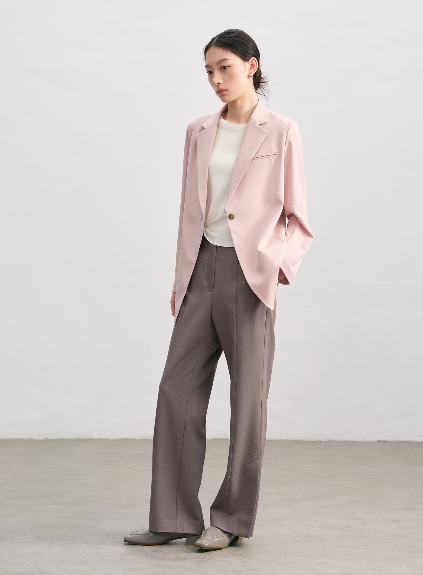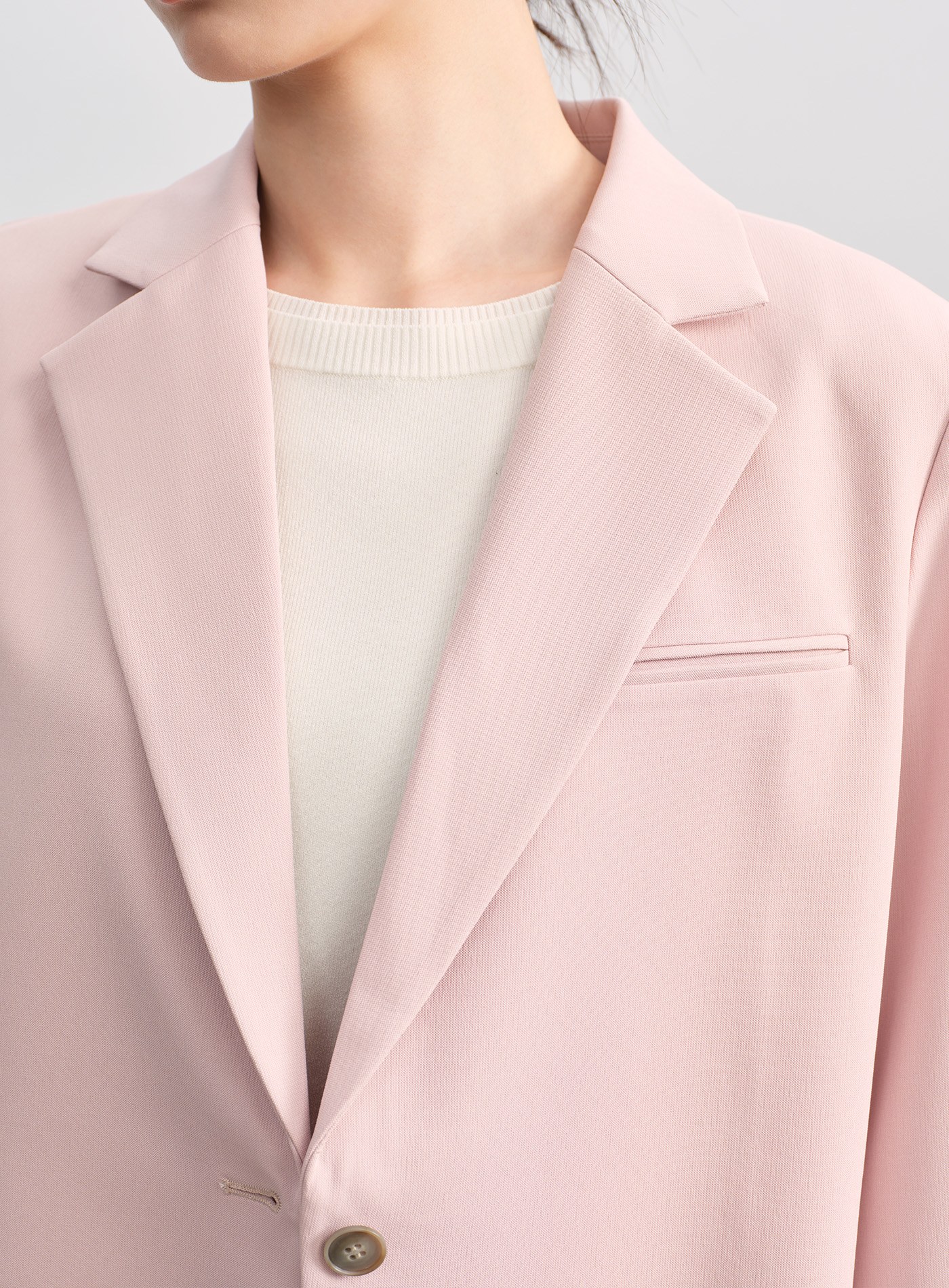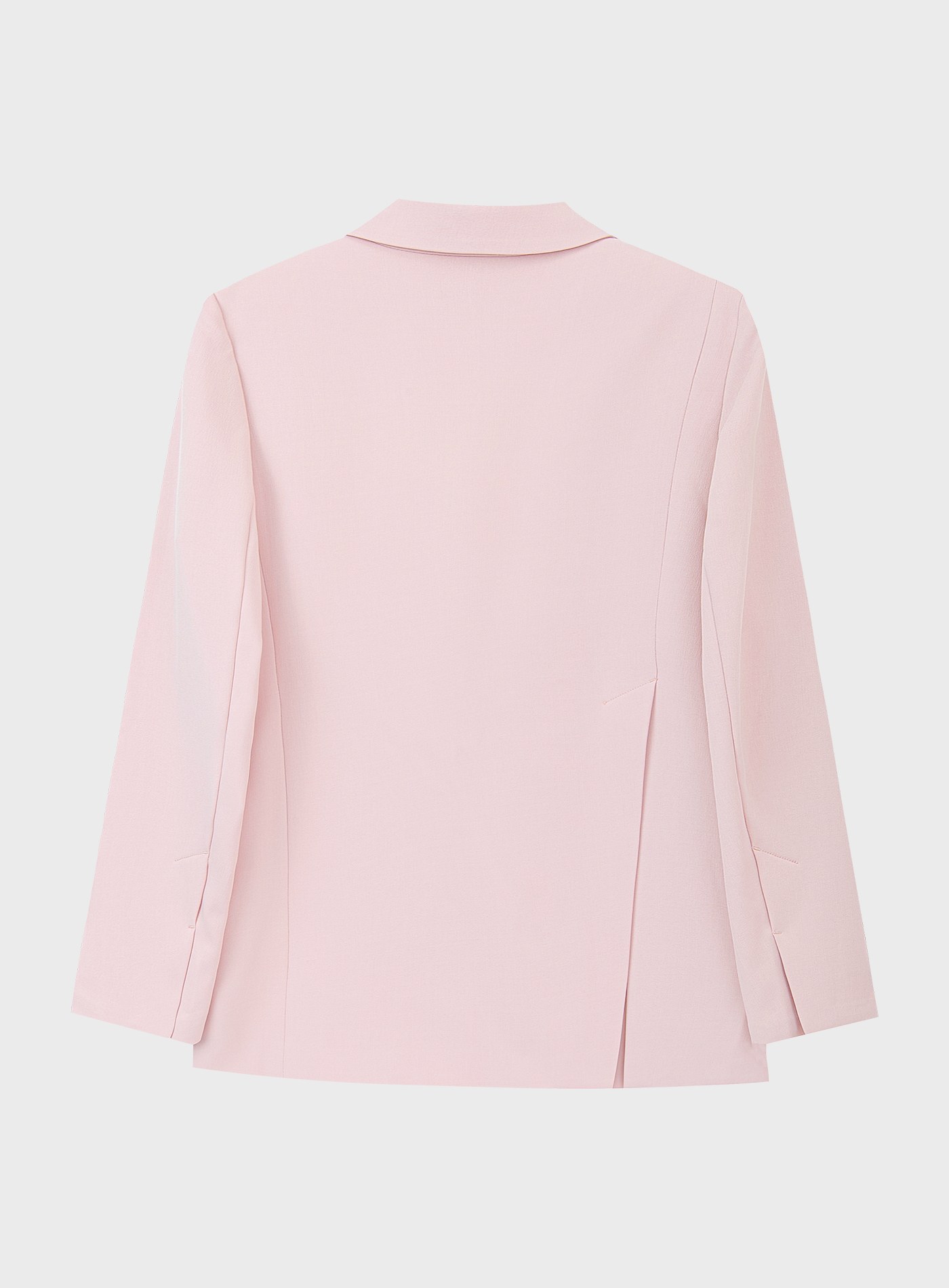 - 不對稱口袋設計增添巧思,可拆卸肩墊與袖口開叉細節,實穿與造型兼具