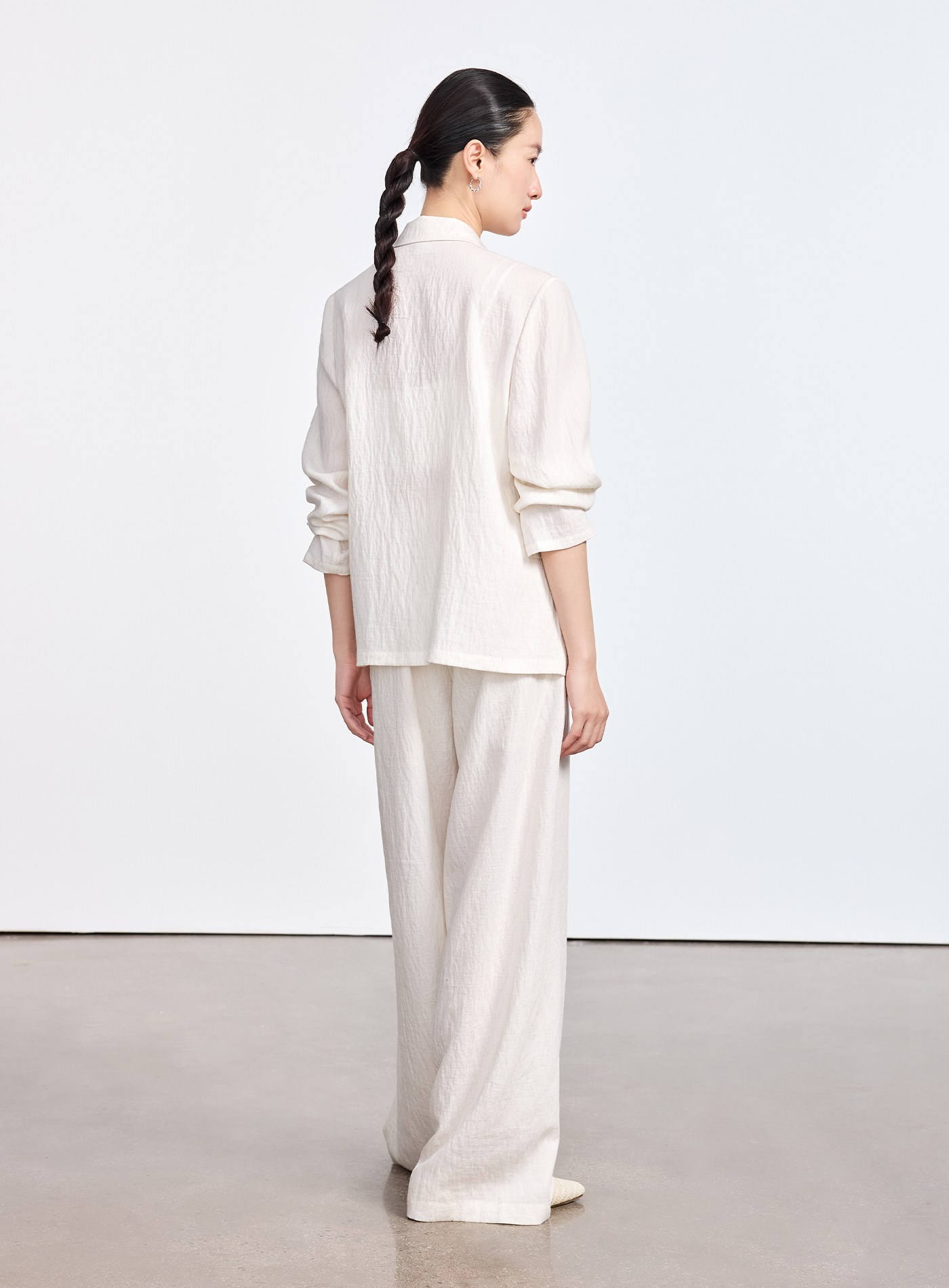 - 面料肌理豐富,上身輕盈涼爽,垂墜透氣,含少量亞麻成分,營造自然棉麻質感,展現隨性度假氛圍