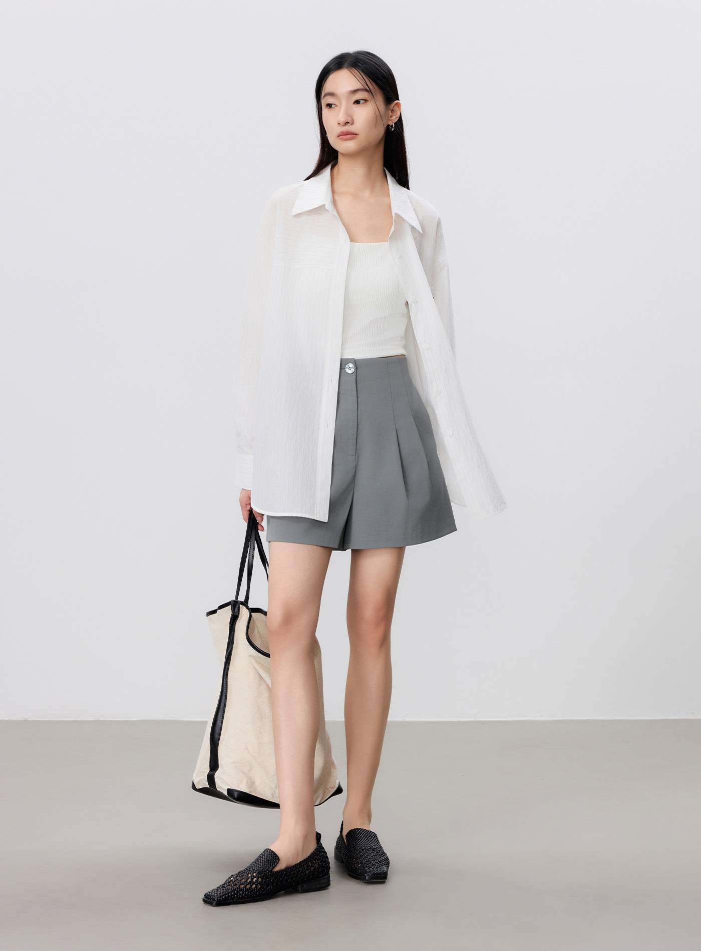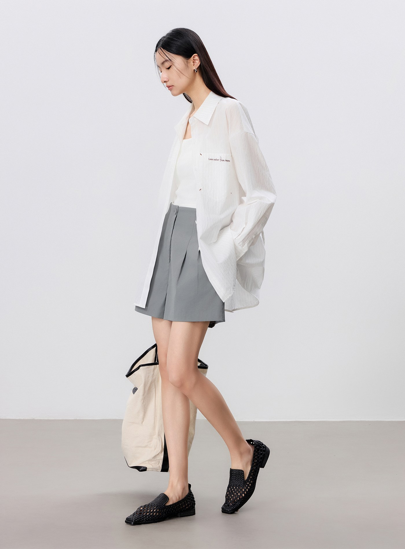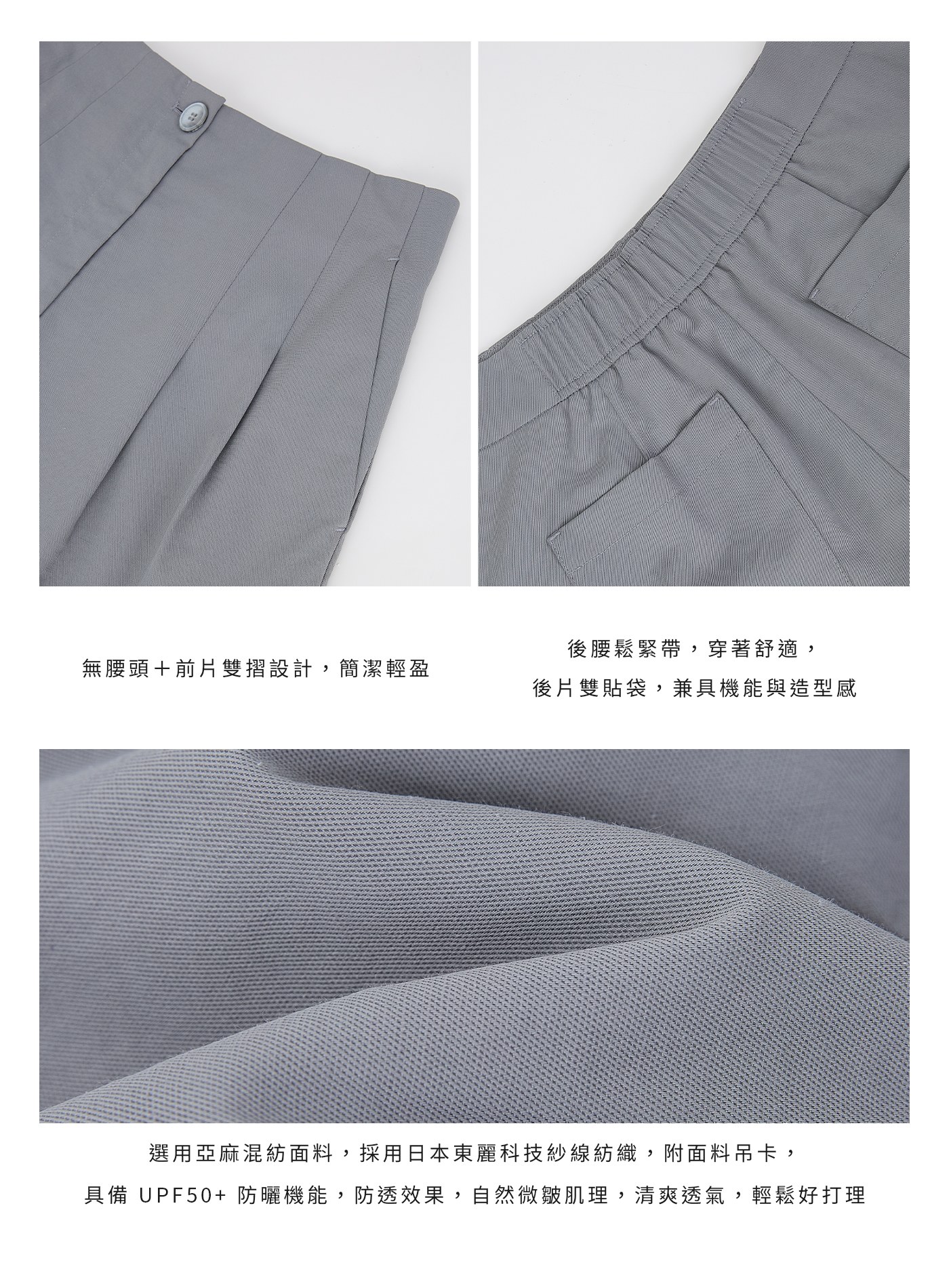 - 選用亞麻混紡面料,採用日本東麗科技紗線紡織,附面料吊卡,具備 UPF50+ 防曬機能,防透效果,自然微皺肌理,清爽透氣,輕鬆好打理