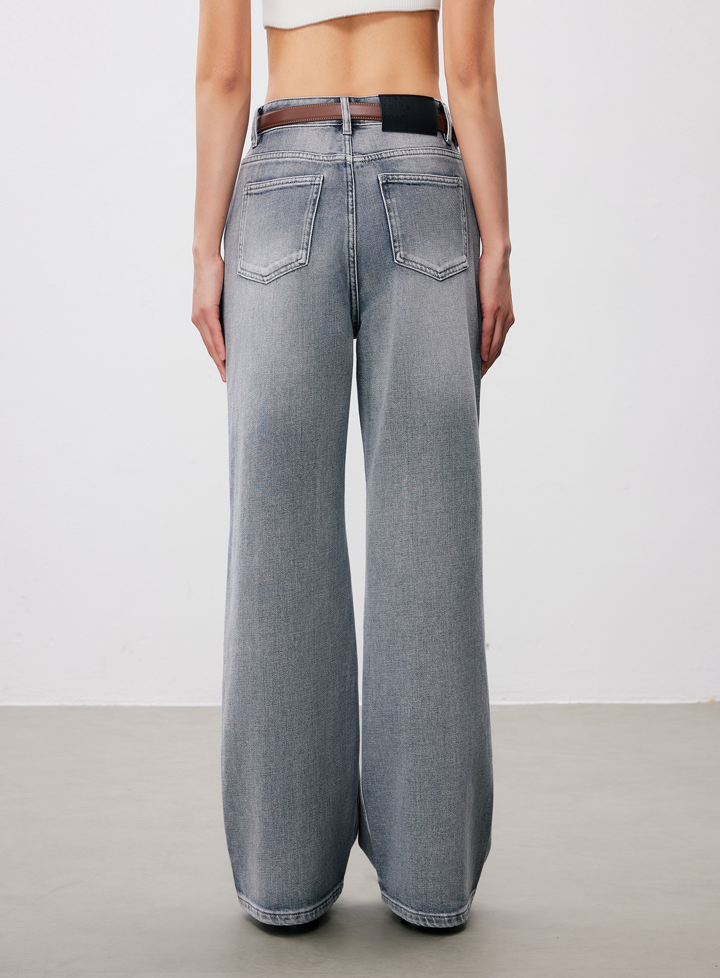 品牌金屬標挺廓後剪接寬褲$76 USD