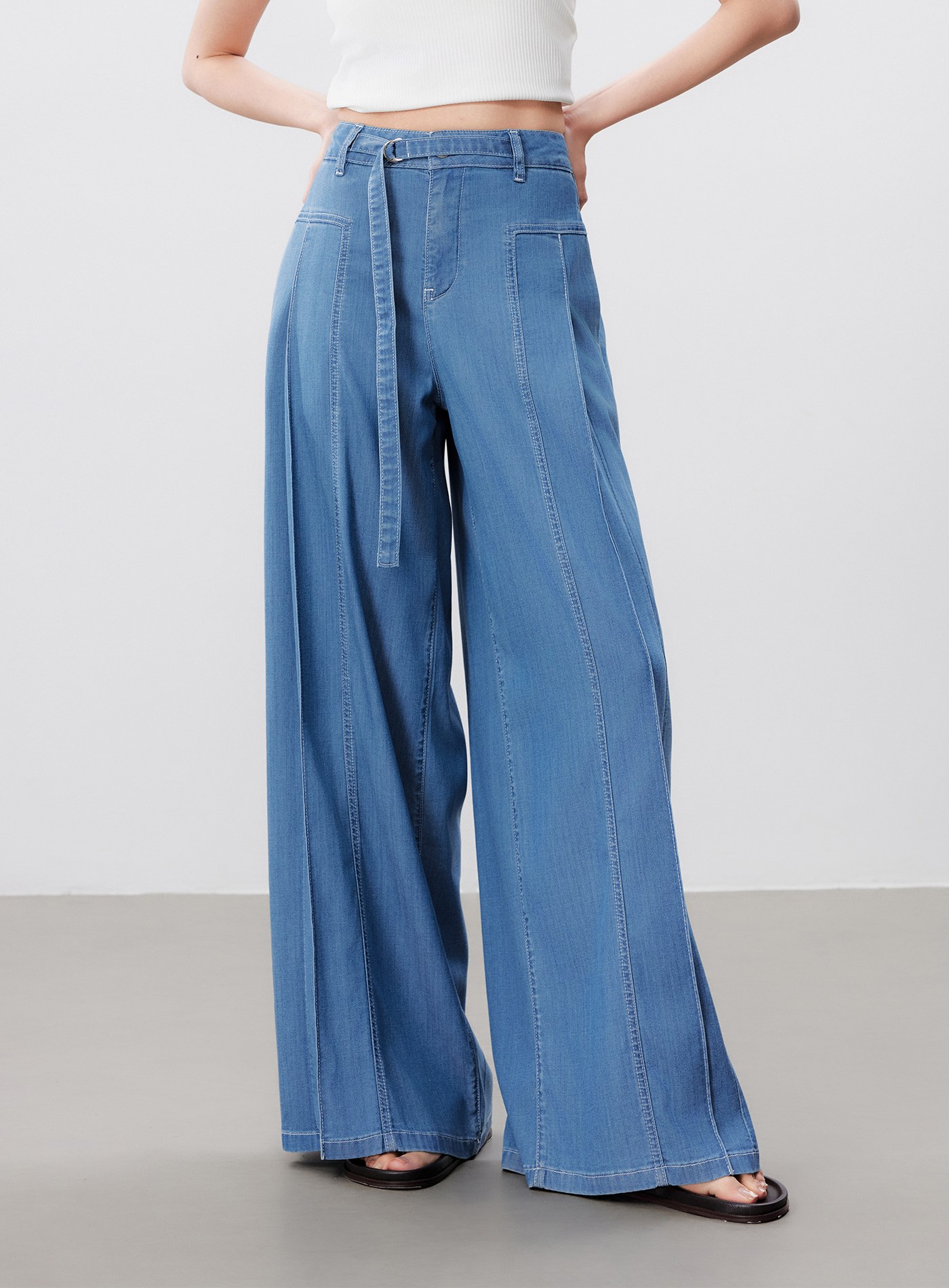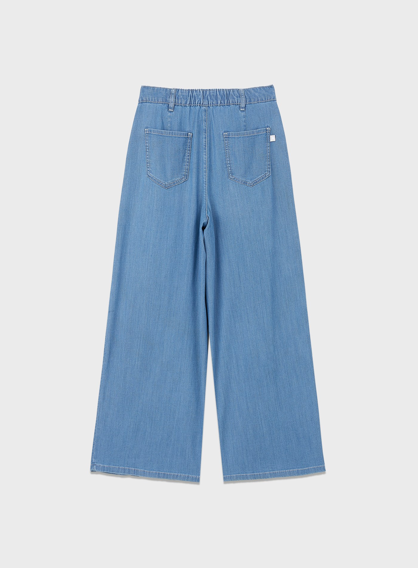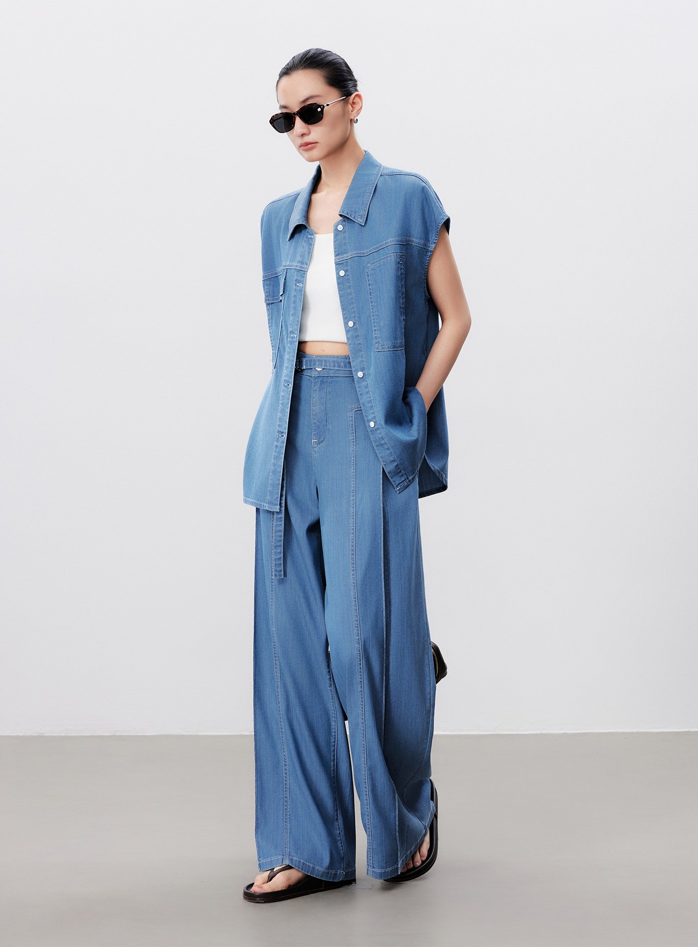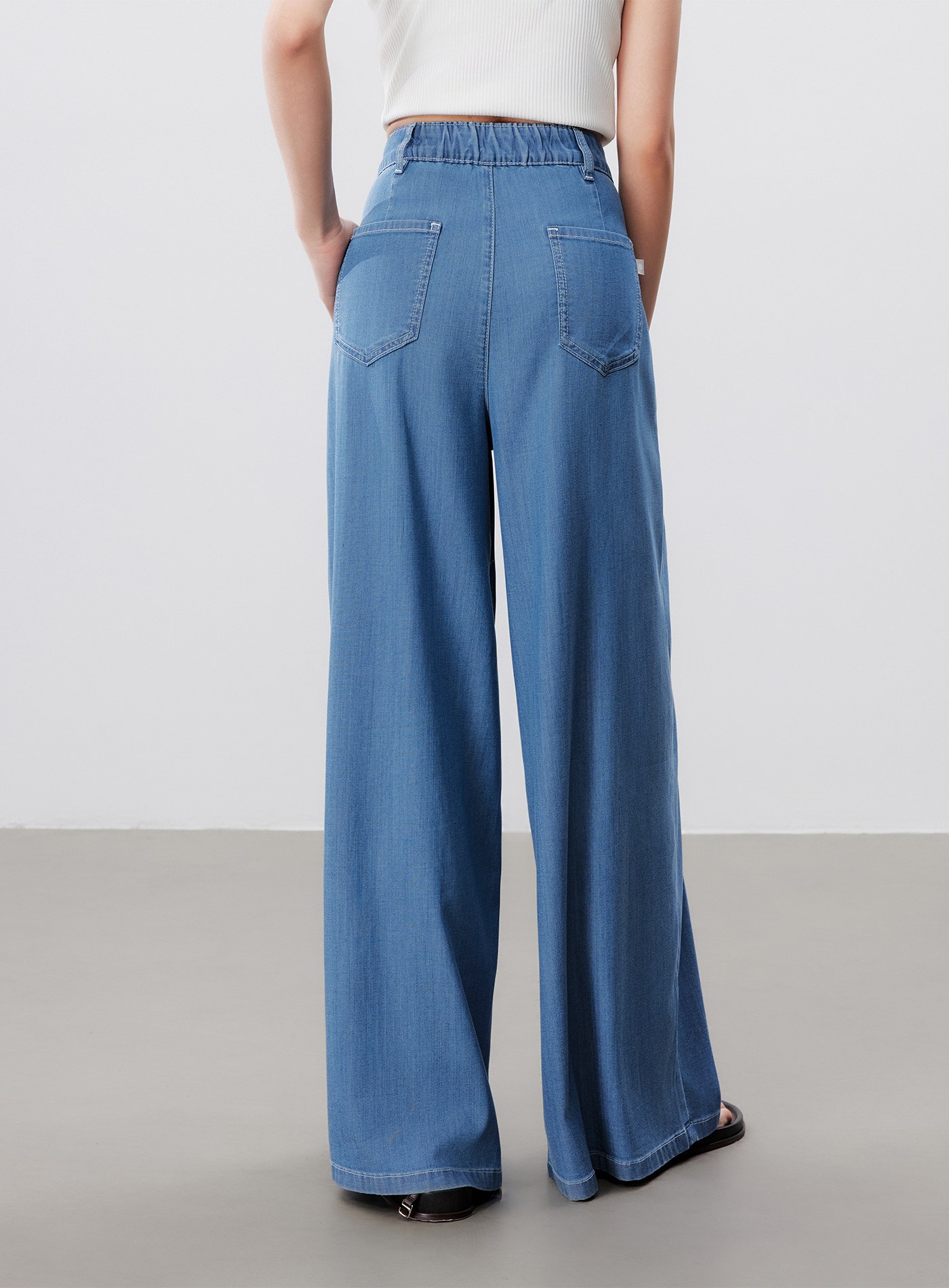 品牌金屬標挺廓後剪接寬褲$76 USD