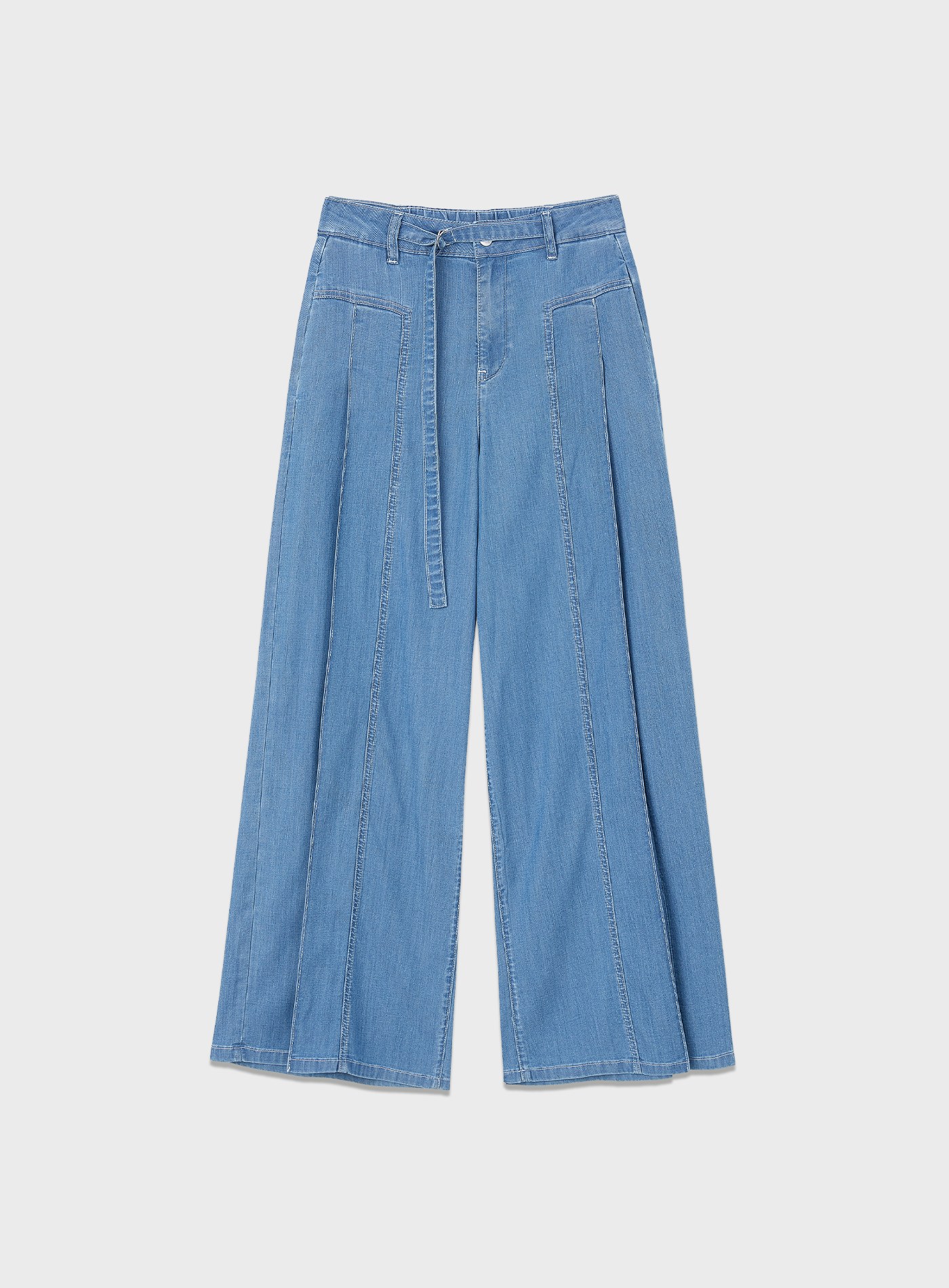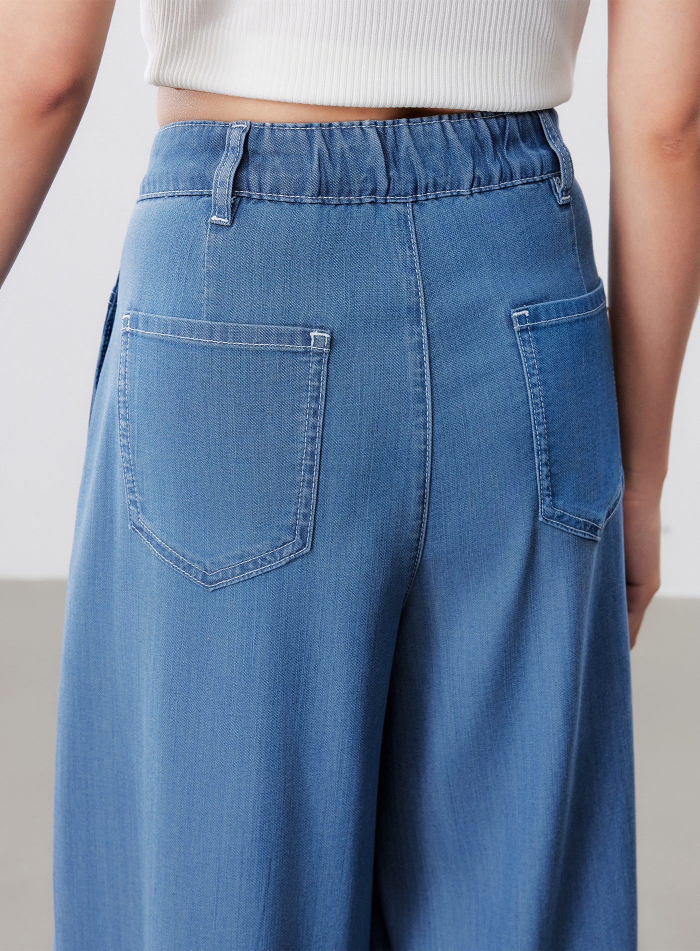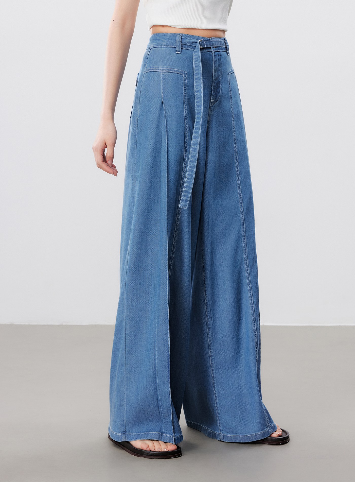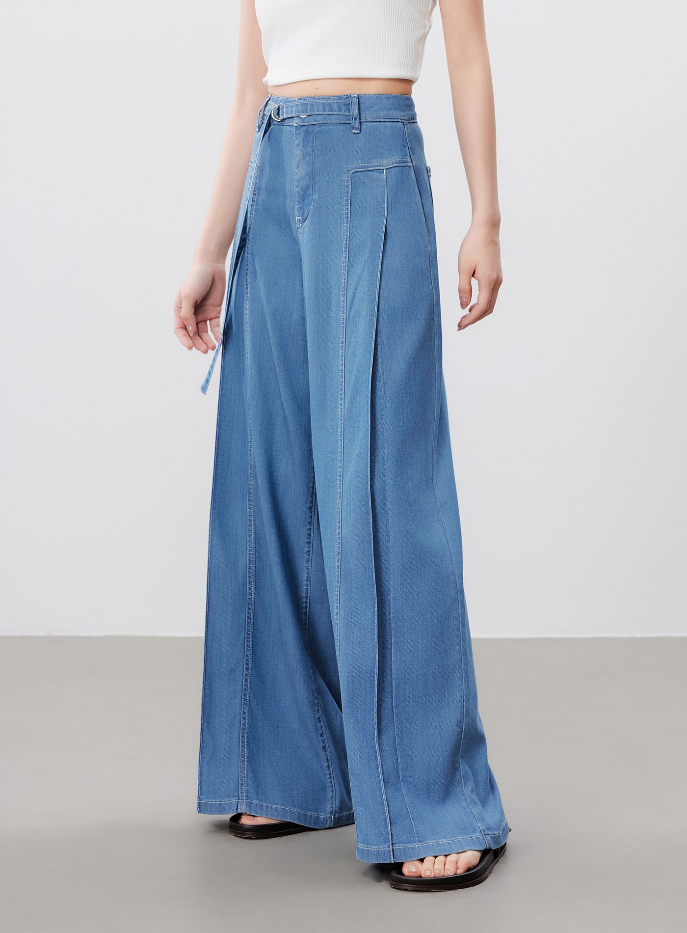 品牌金屬標挺廓後剪接寬褲$76 USD