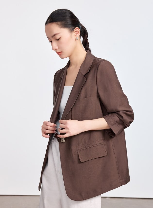 - 選用錦綸、TENCEL™ 天絲與亞麻混紡面料,質地輕盈挺闊,呈現自然皺折肌理。