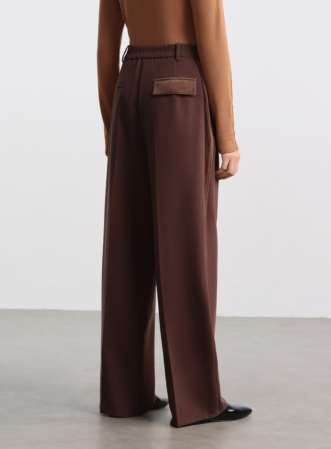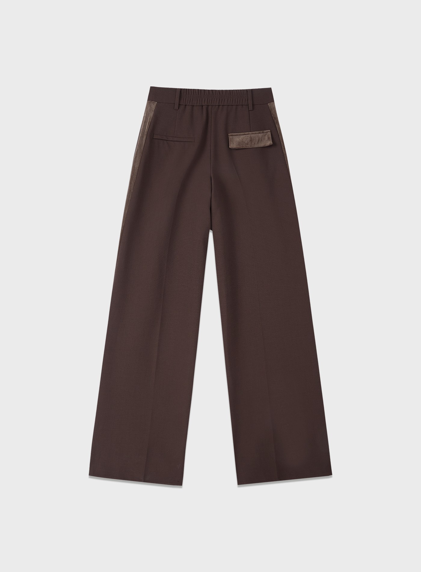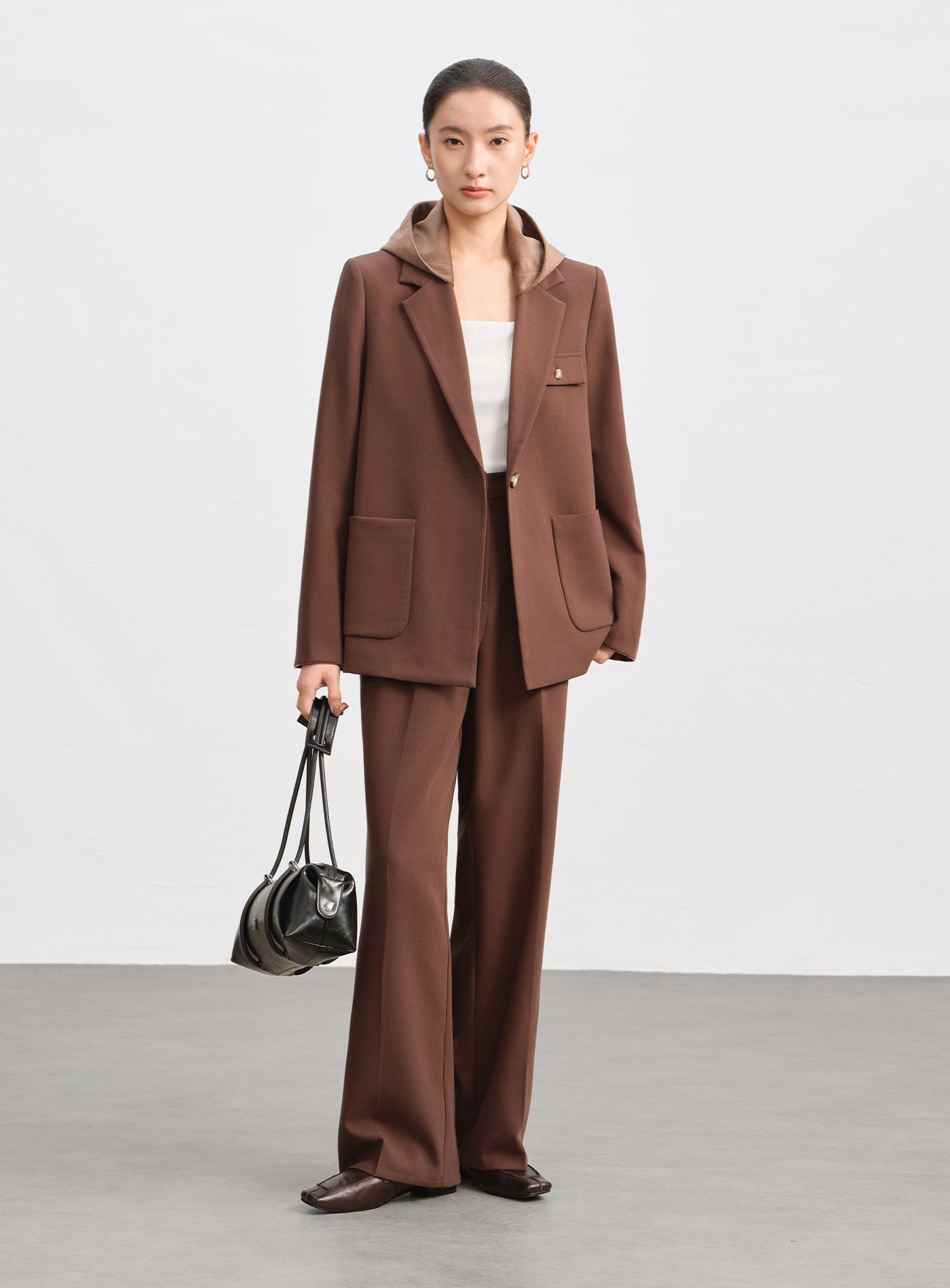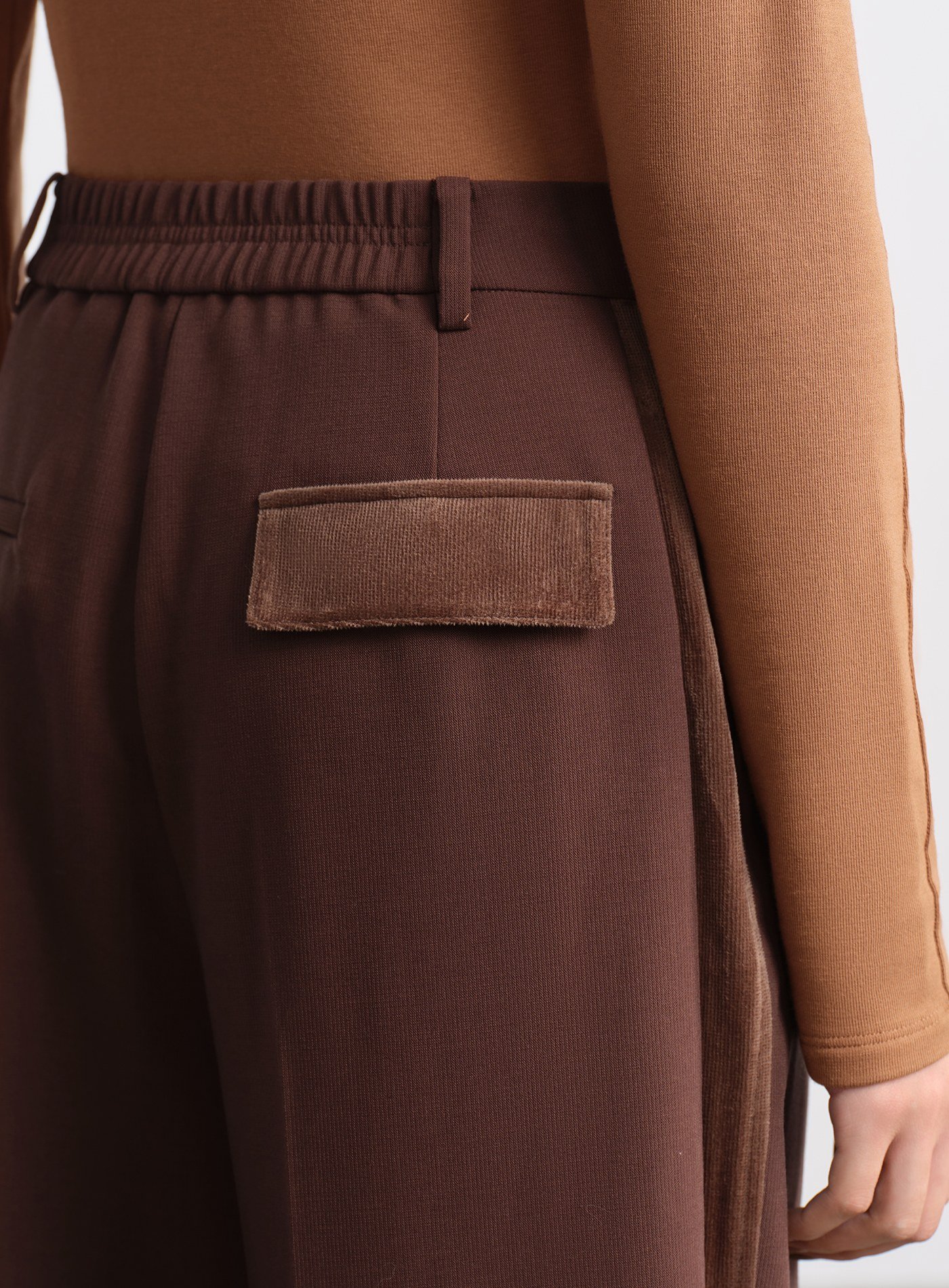 - 褲身前後片採用斜向裁剪,以短絨坑條絨素材拼接,自然修飾腿型