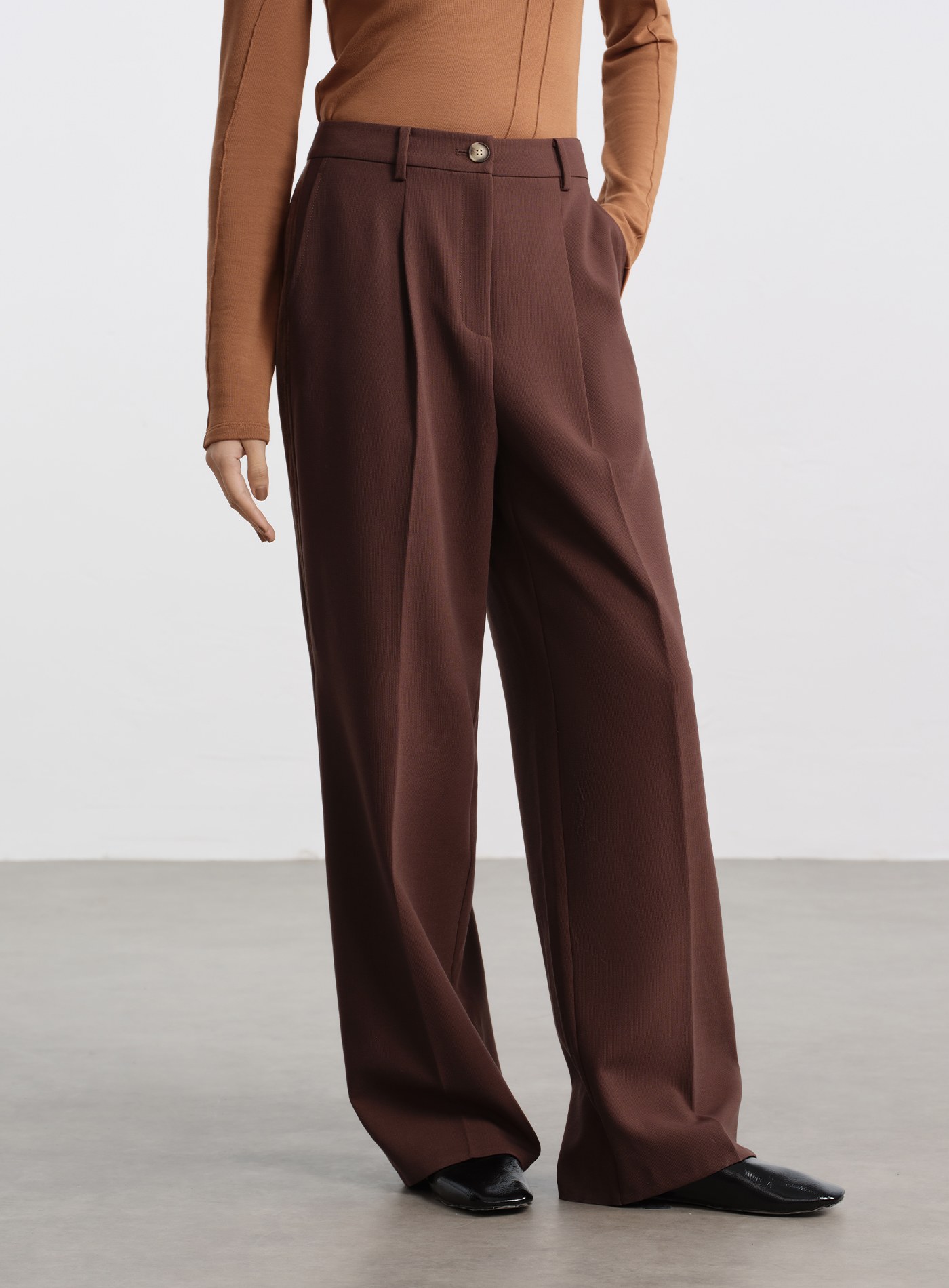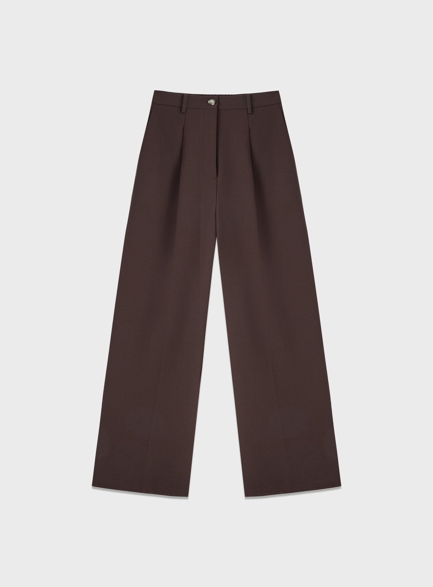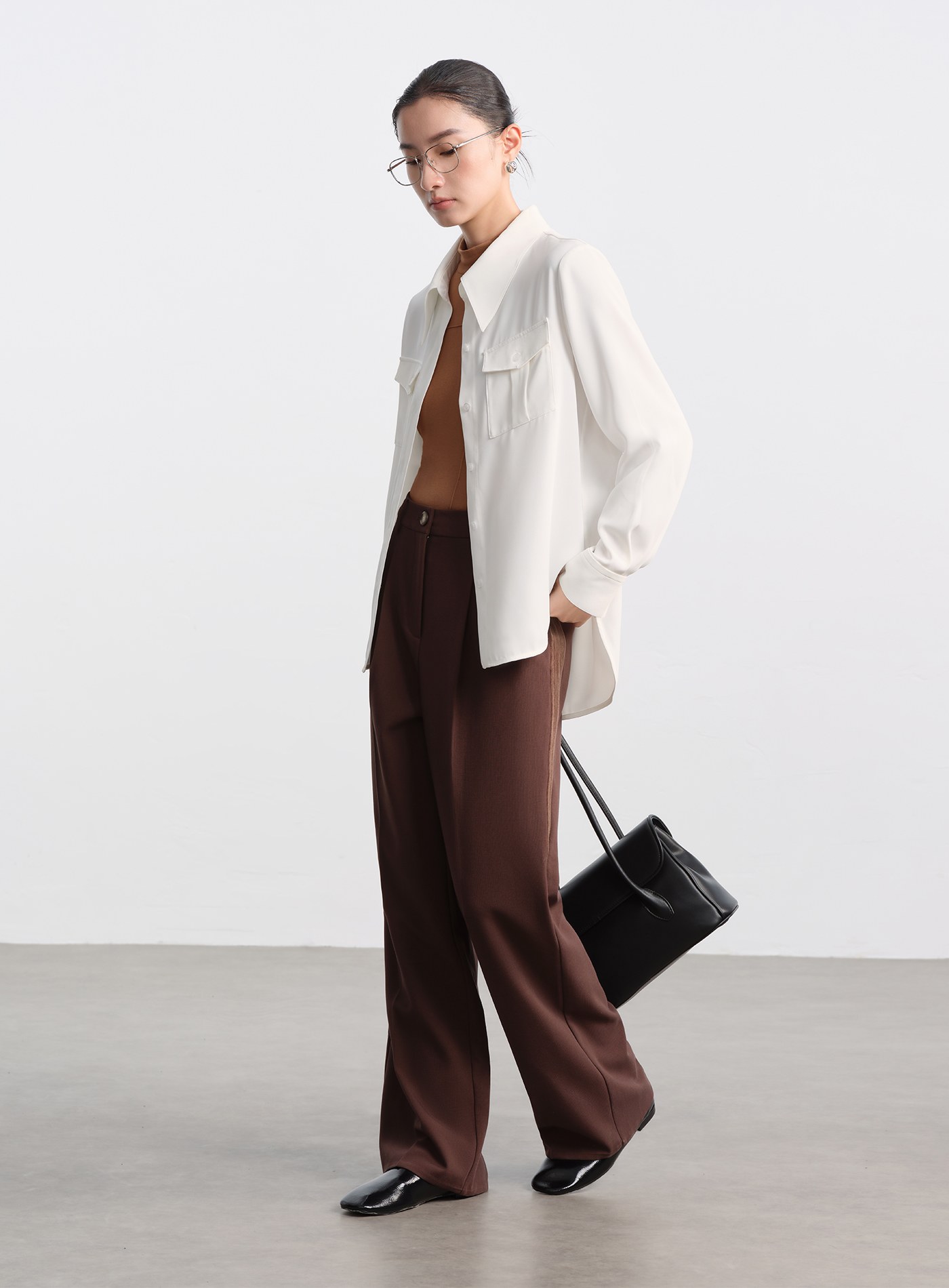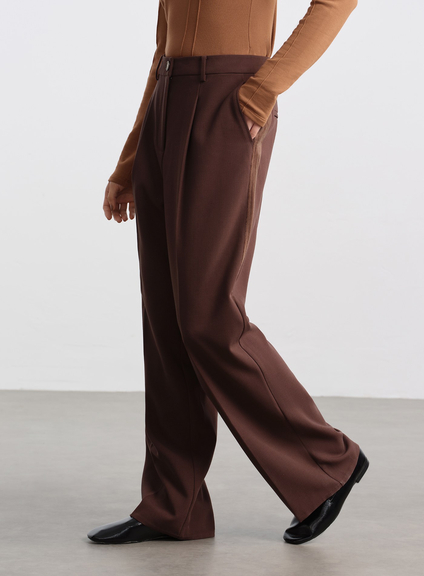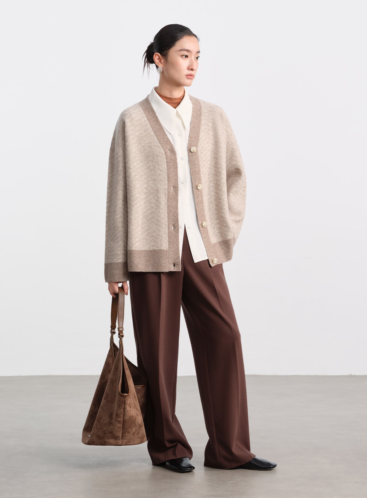- 褲身前後片採用斜向裁剪,以短絨坑條絨素材拼接,自然修飾腿型