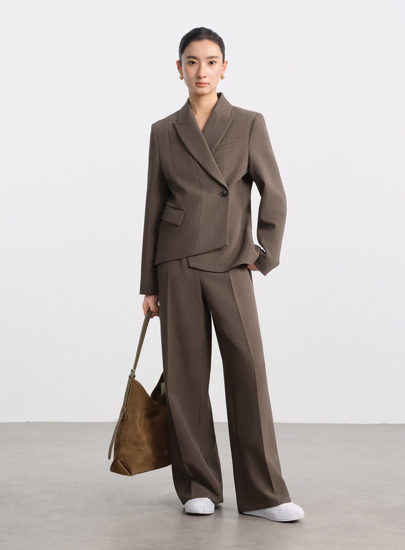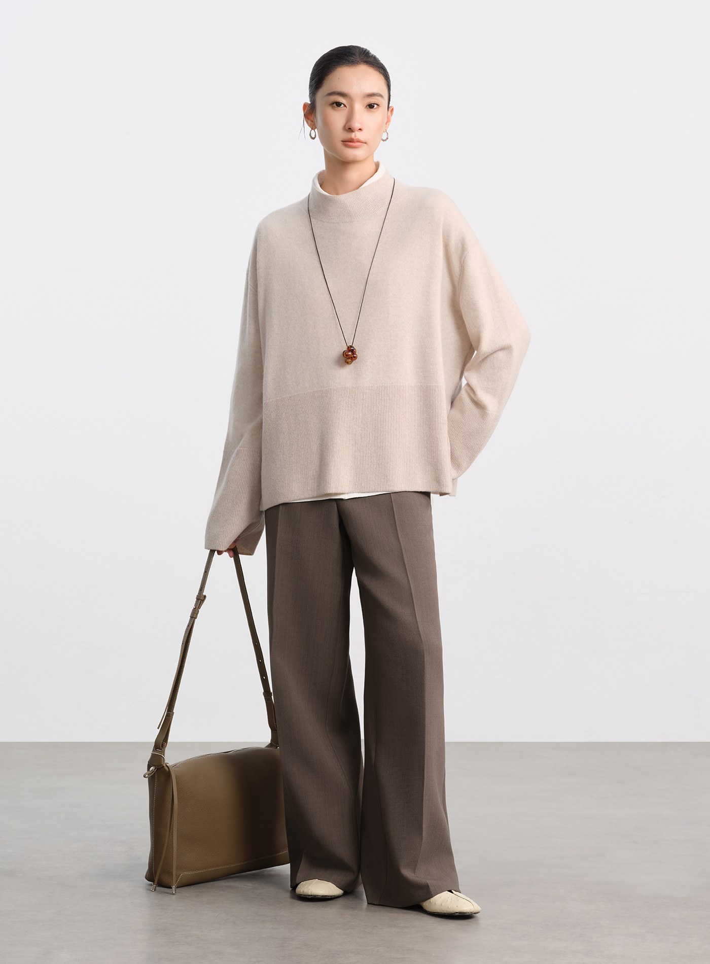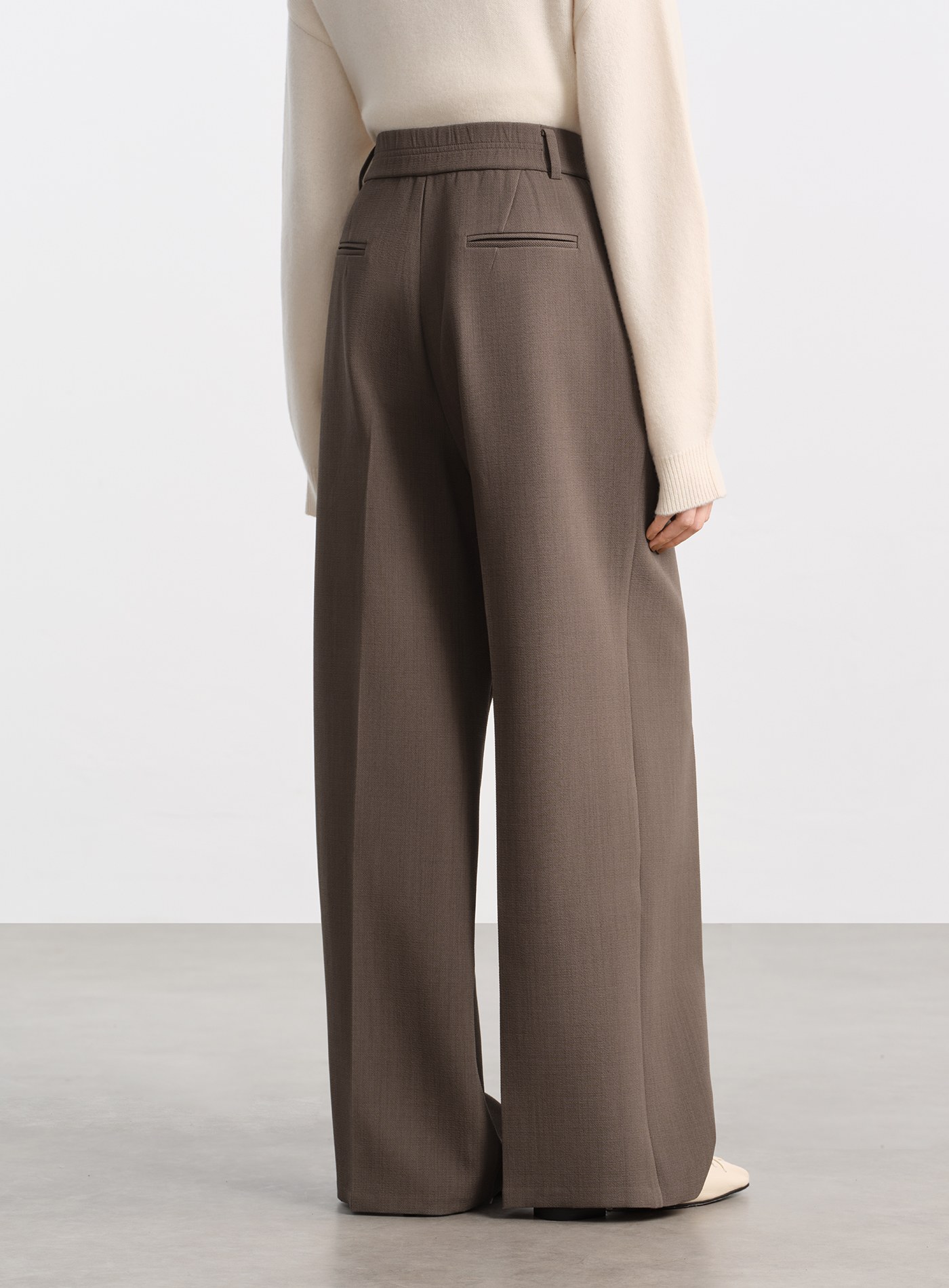 - 後腰加入彈性鬆緊設計,自在包容不同身形,高腰搭配寬褲線條,讓比例自然拉長
