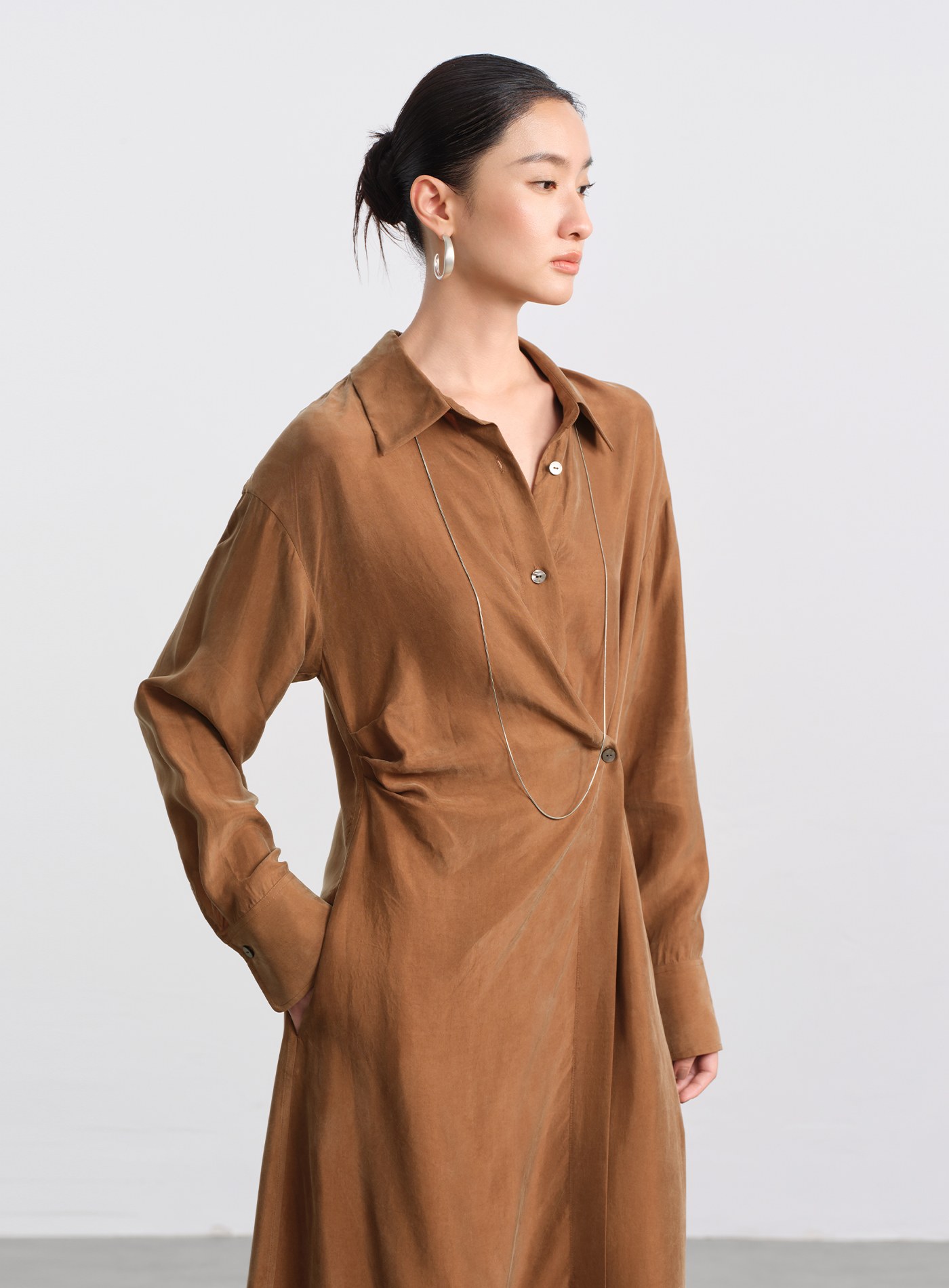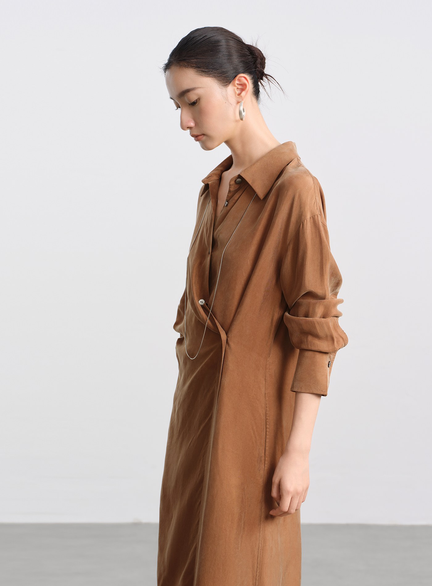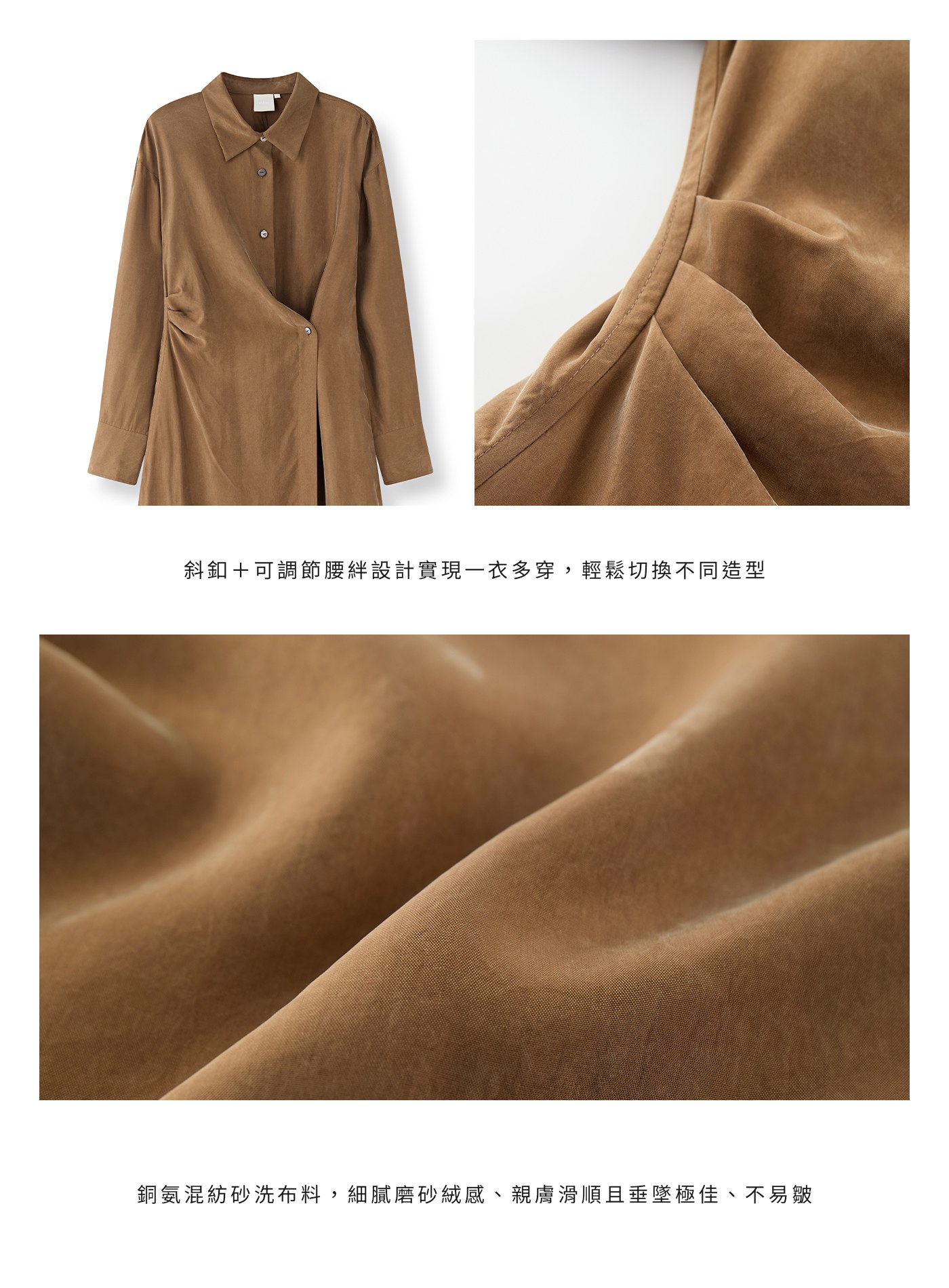 - 透過斜釦與可調節腰絆,可穿成收腰斜擺連身裙,也可打開當成直排釦長襯衫外套