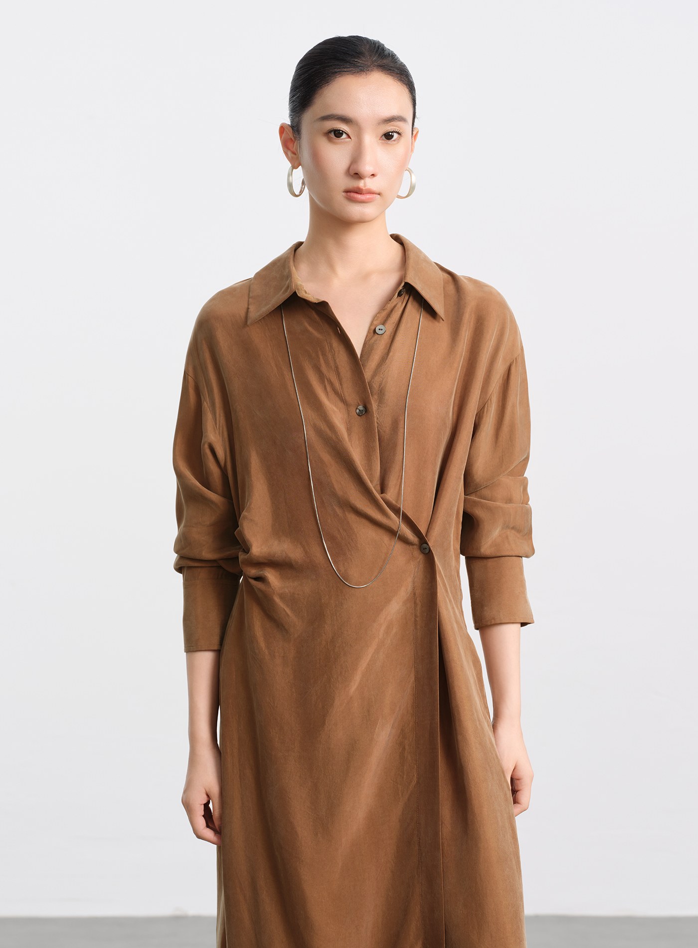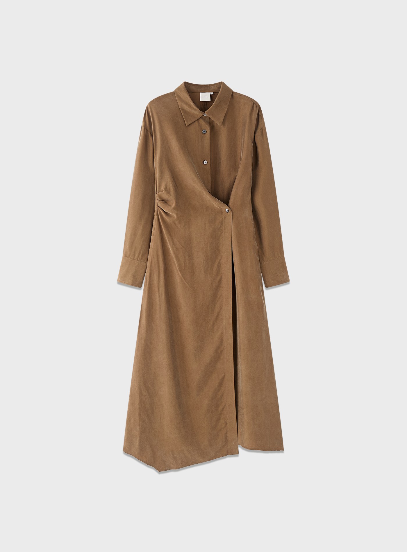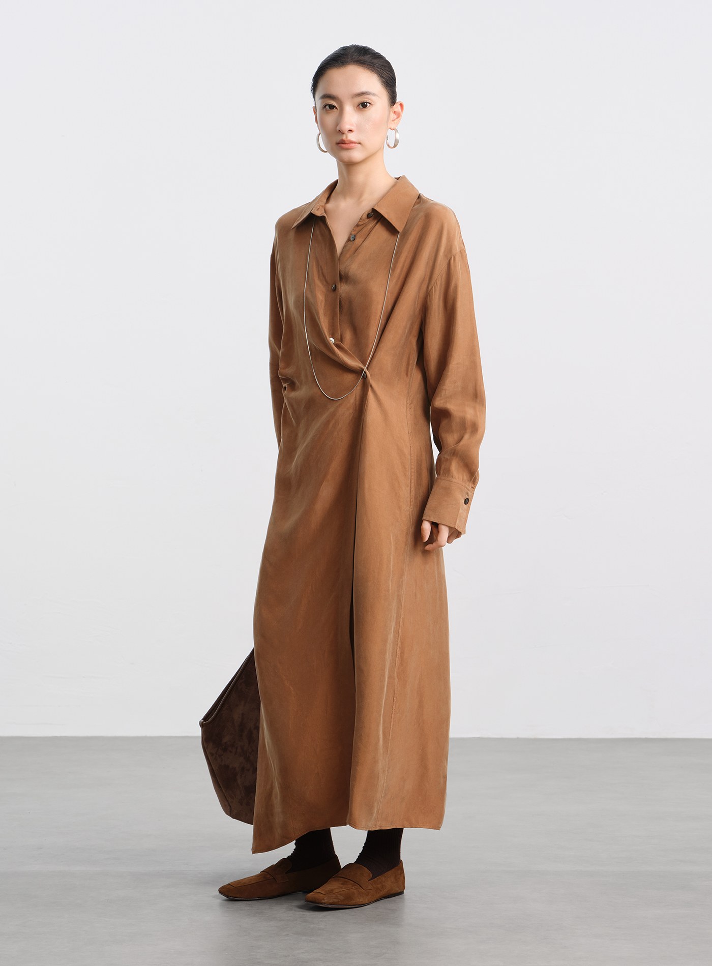 - 透過斜釦與可調節腰絆,可穿成收腰斜擺連身裙,也可打開當成直排釦長襯衫外套