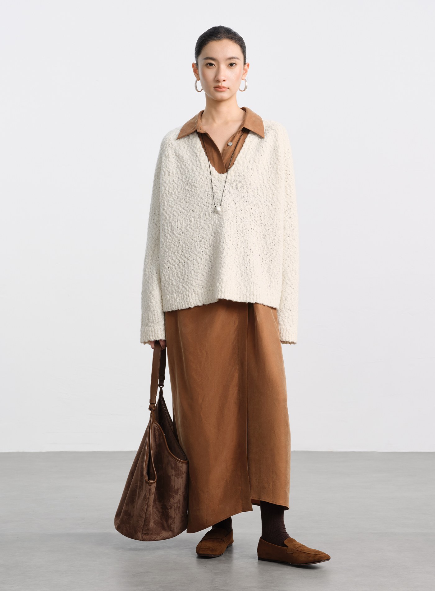 - 下擺採用不對稱剪裁,搭配扭結穿法,走動時會呈現靈動的弧線