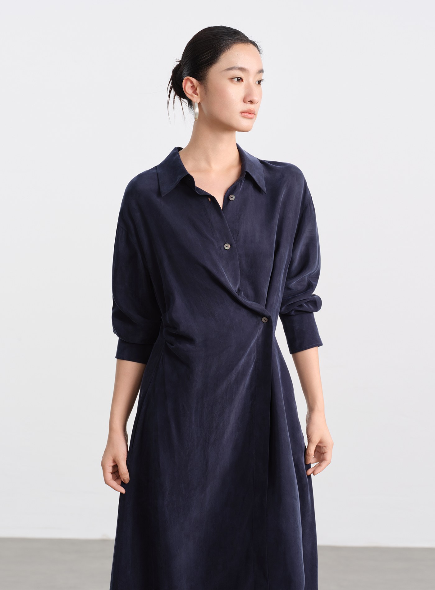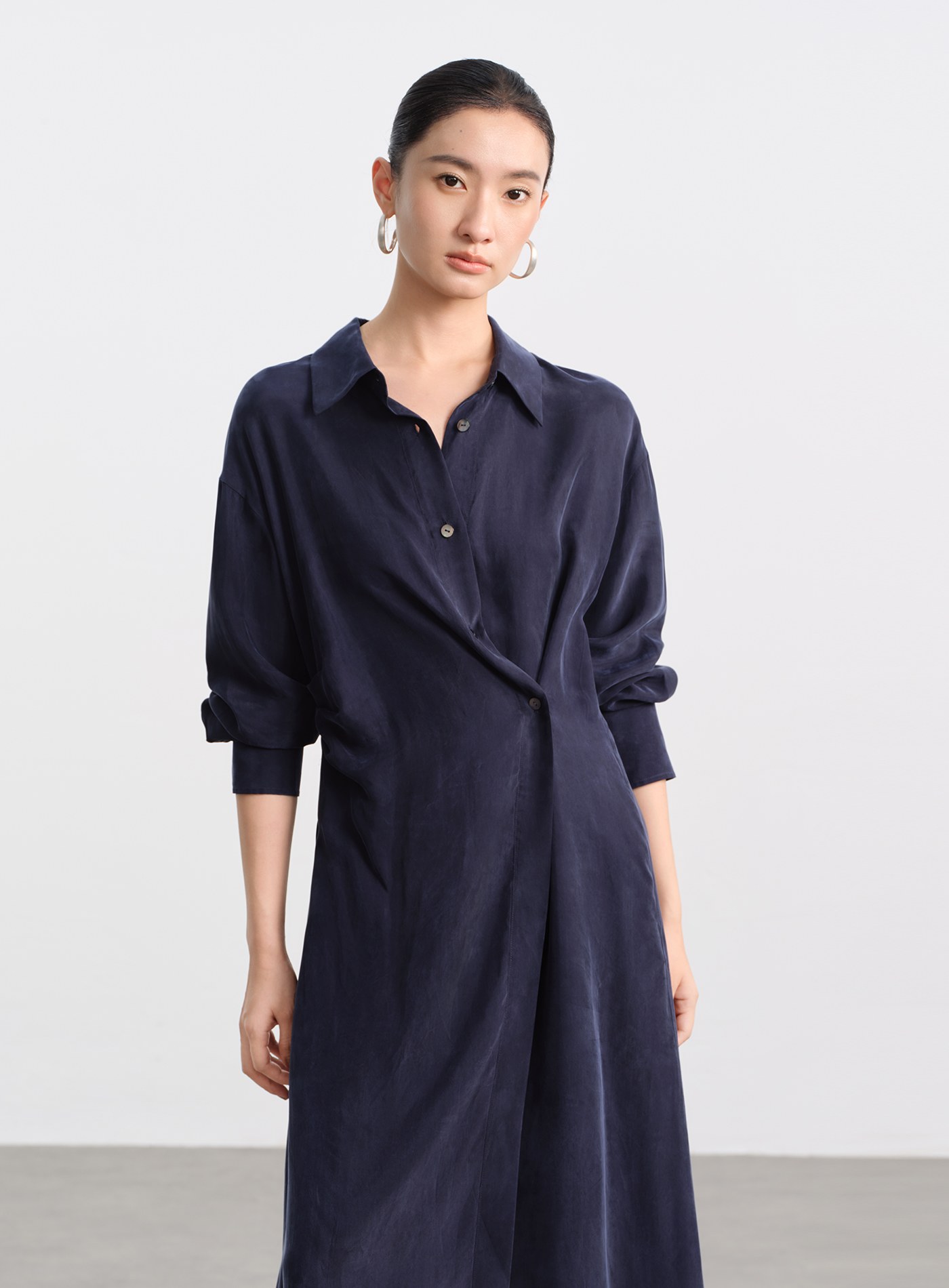 - 材質選用銅氨混紡砂洗布料,帶著細膩霧面與絲滑觸感,垂墜線條乾淨利落,不易皺、透氣、親膚