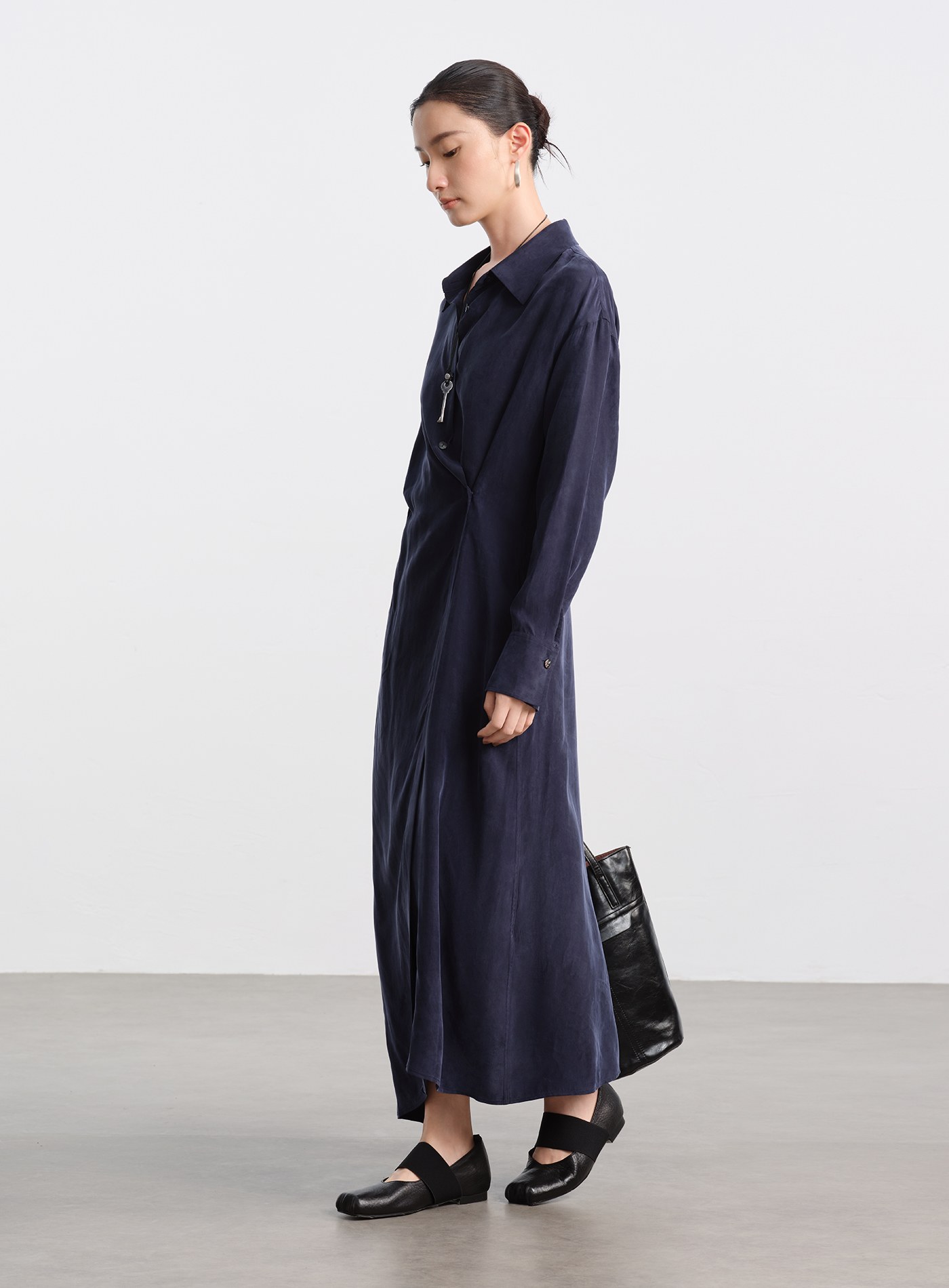 - 下擺採用不對稱剪裁,搭配扭結穿法,走動時會呈現靈動的弧線