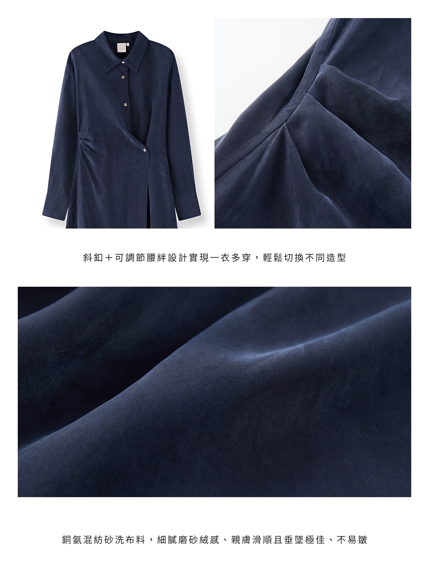 - 透過斜釦與可調節腰絆,可穿成收腰斜擺連身裙,也可打開當成直排釦長襯衫外套