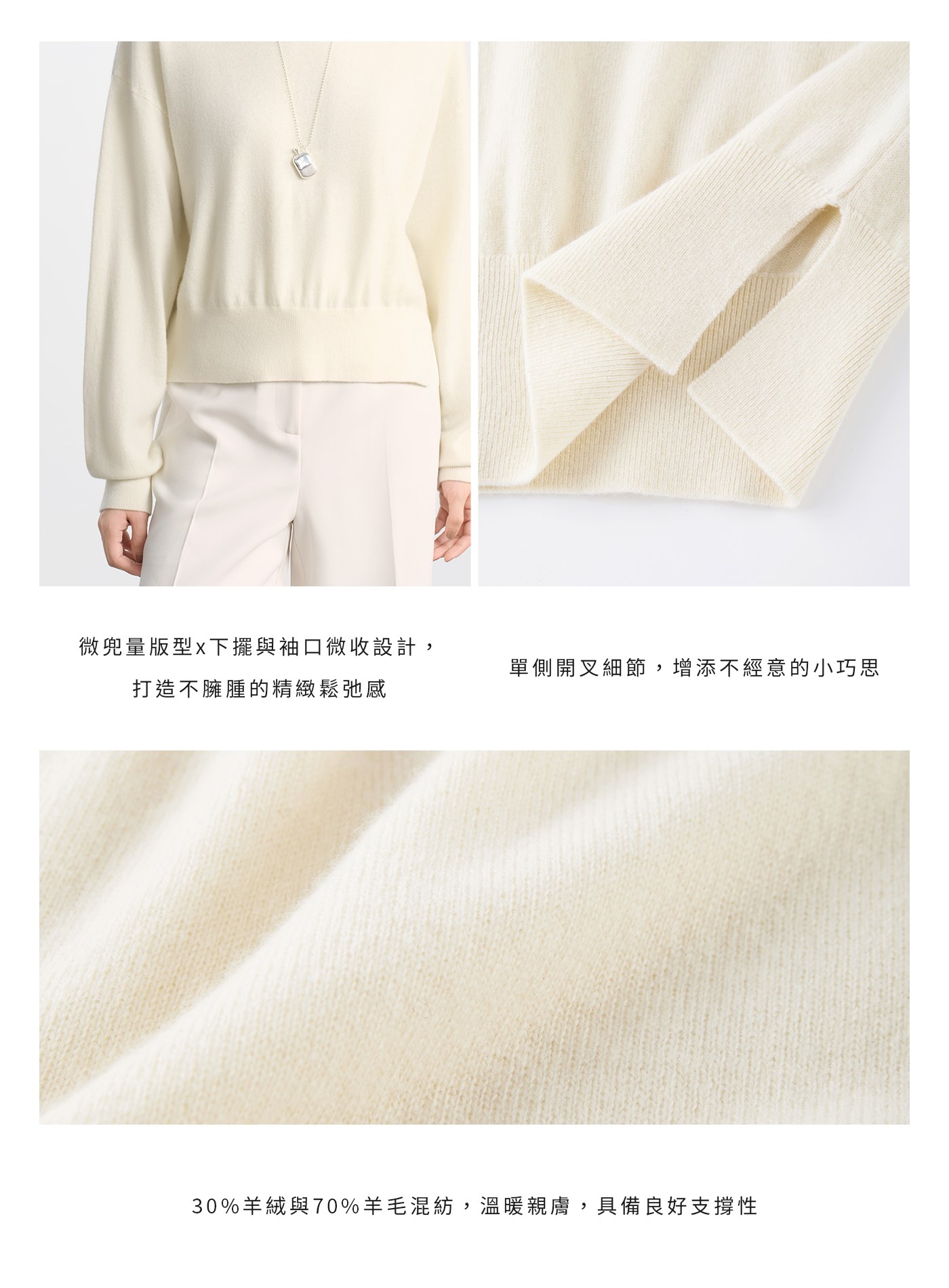 - 30%羊絨與70%羊毛混紡,帶來柔軟貼膚的高級觸感;羊絨的輕盈暖度與羊毛的支撐彈性完美平衡,既保暖又能維持俐落挺度,不易變形