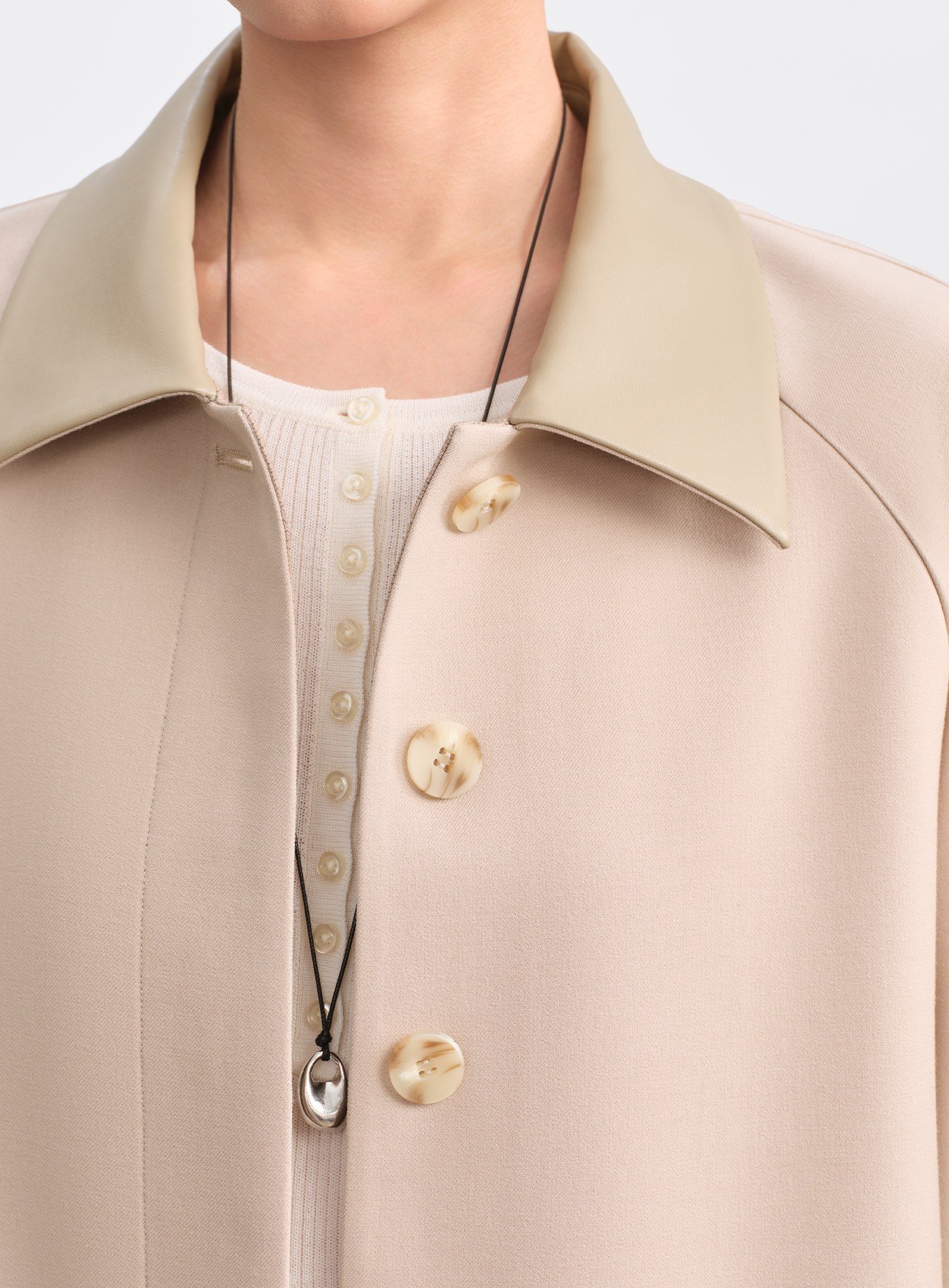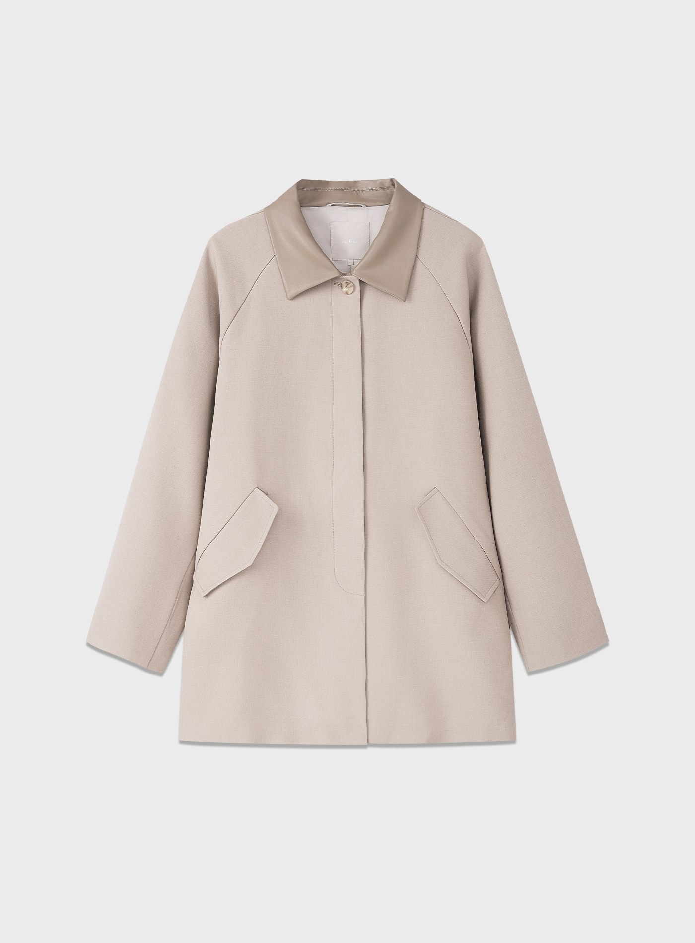 - 領片採用蛋白皮革拼接,呈現微亮質感;袖部再加入 格紋元素,讓經典格調與俐落版型交織,復古卻不老氣,耐看又有辨識度