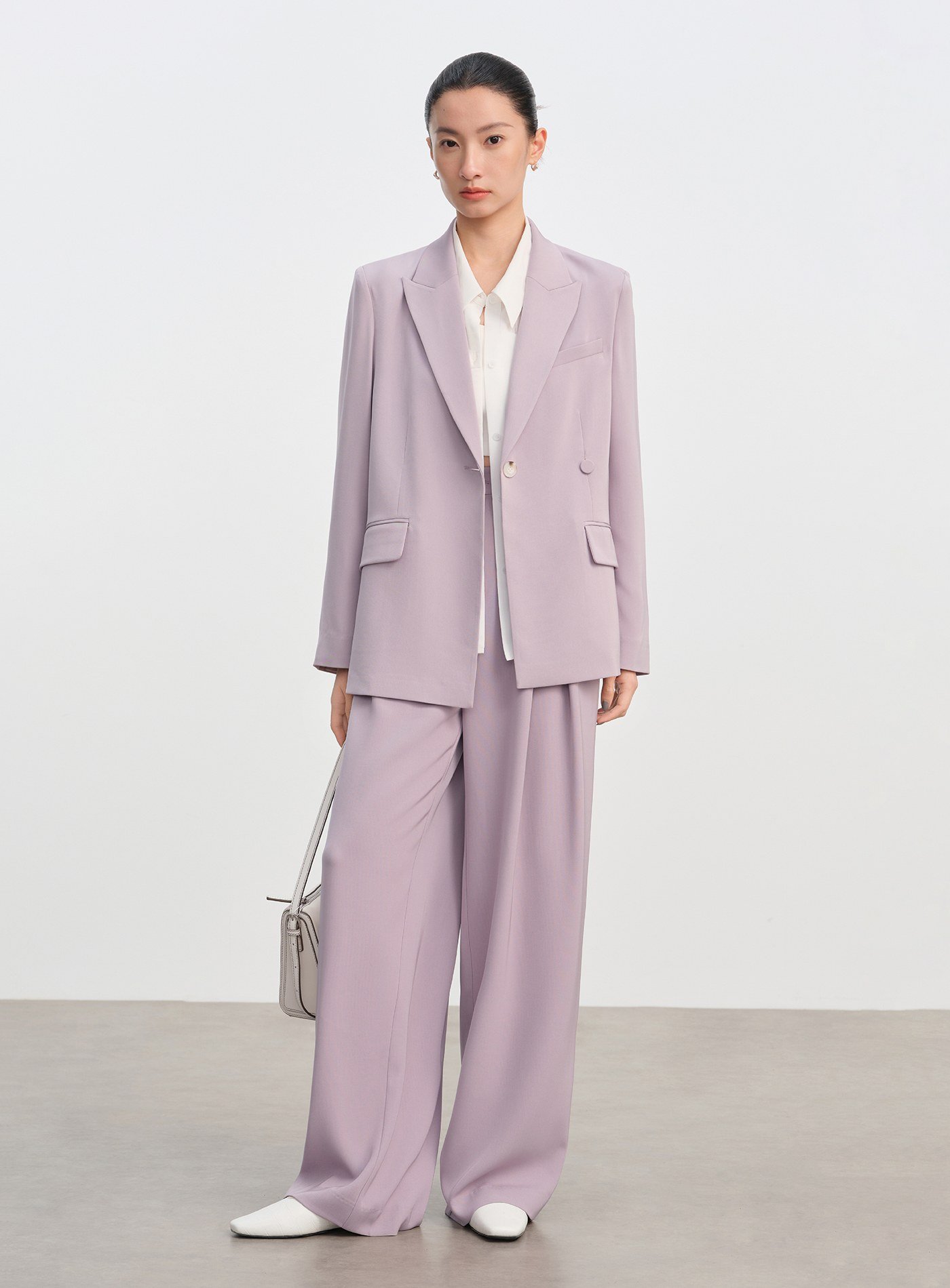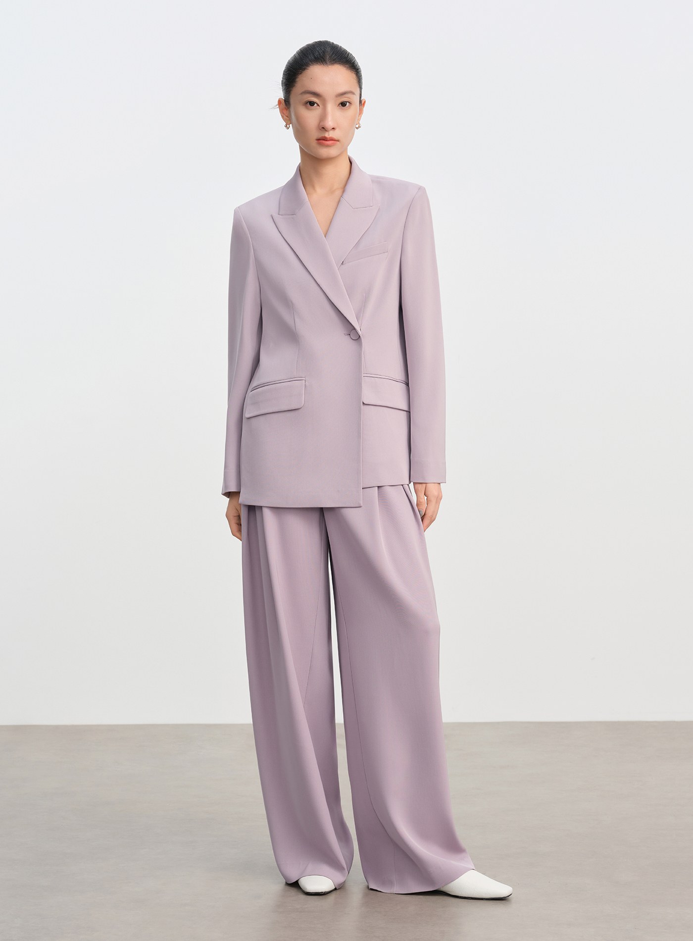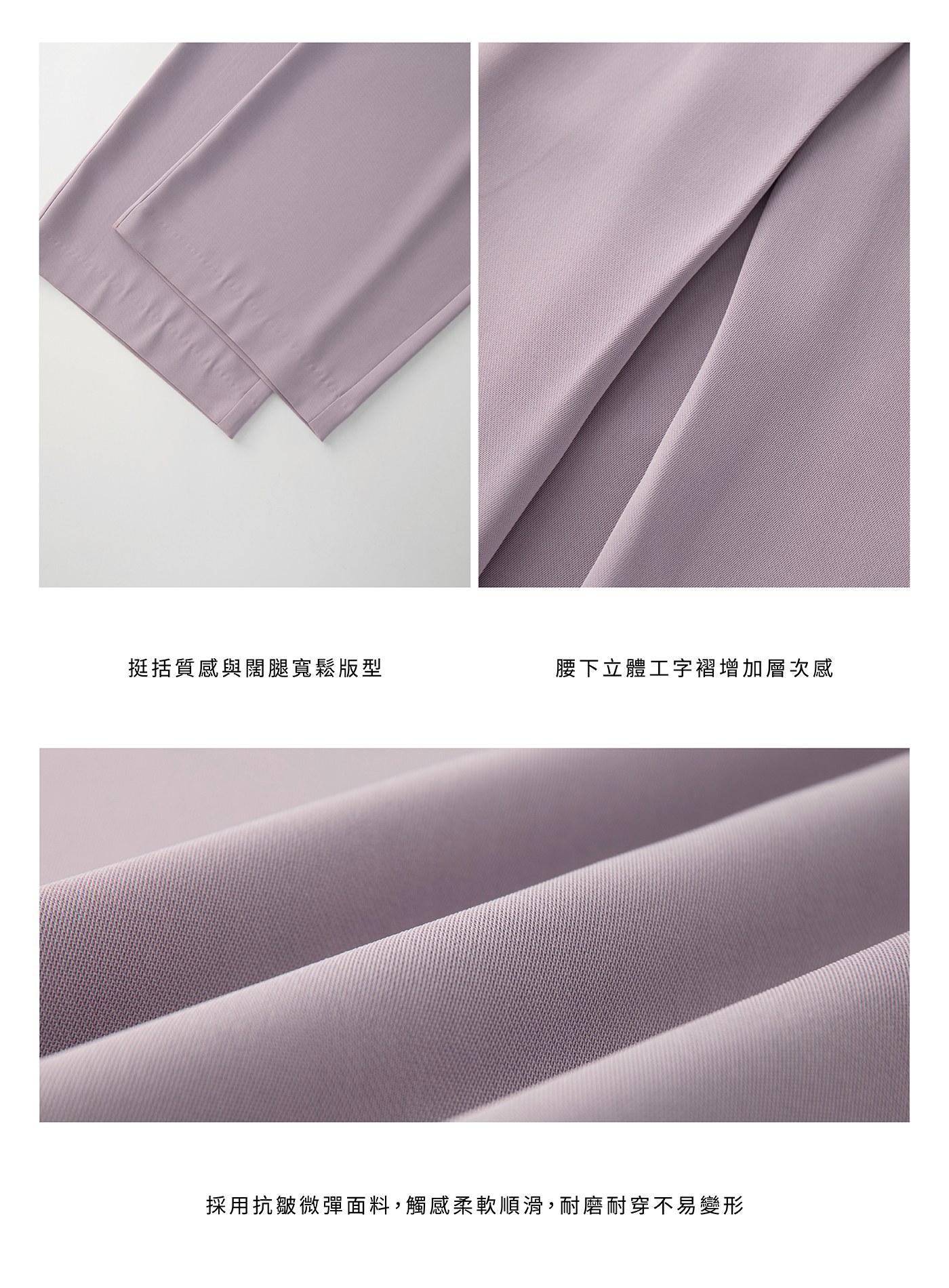 - 以中腰垂感剪裁為核心,結合西裝面料的挺括質感與闊腿寬鬆版型,適合通勤與休閒多場景穿搭
