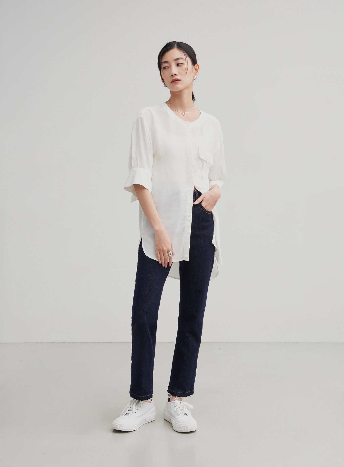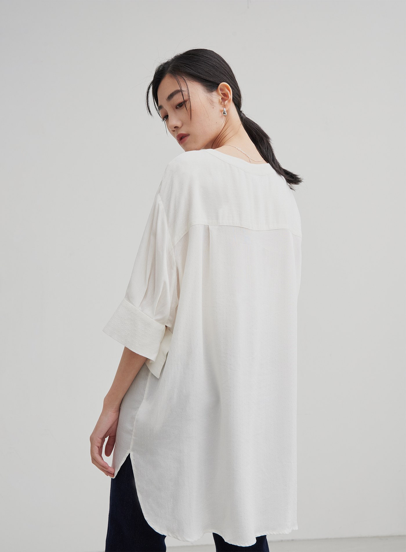 不對稱領開衩長袖上衣$63 USD