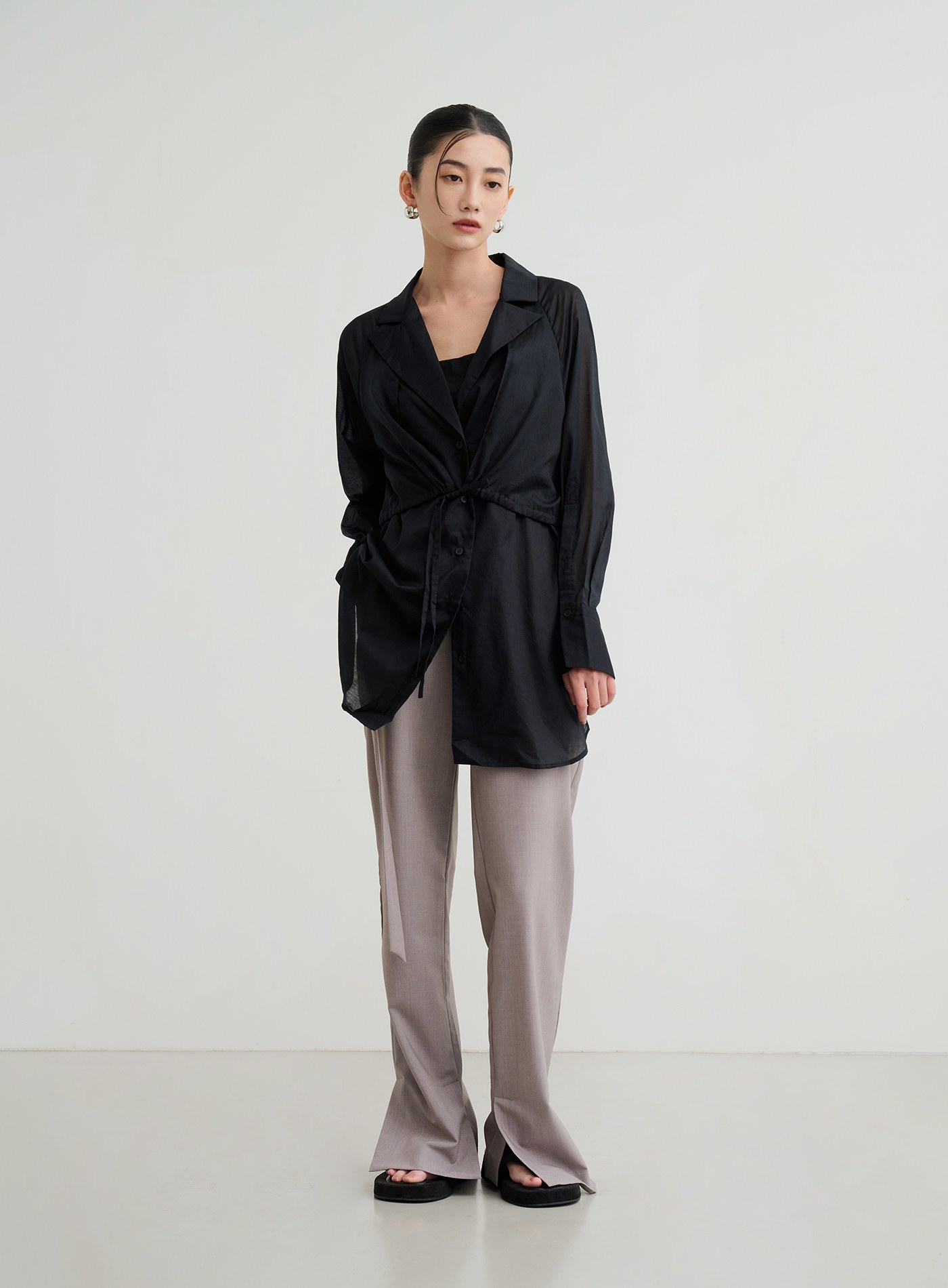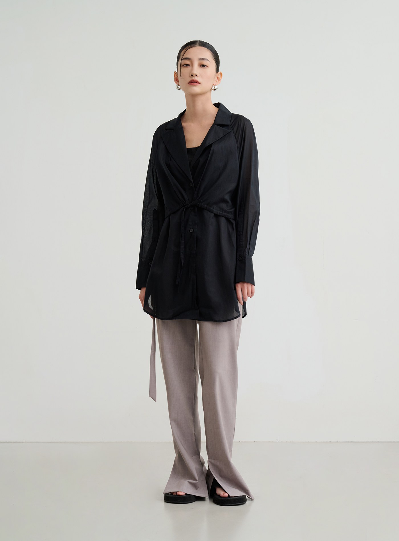 - 抽繩綁帶可調節,側邊下擺圓弧開衩,