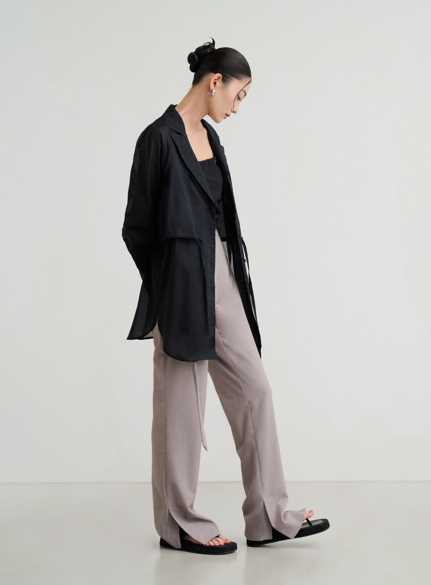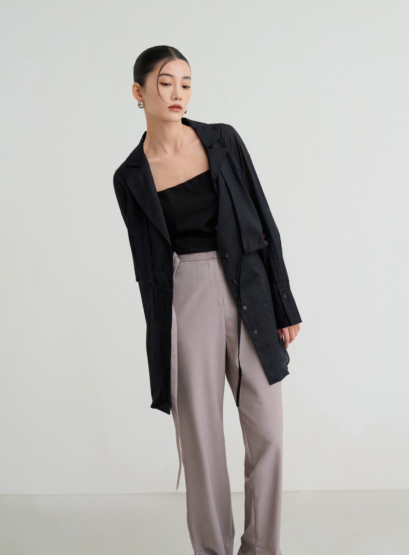 - 長版直筒版型,西裝領設計,上身雙層片設計,增加造型感